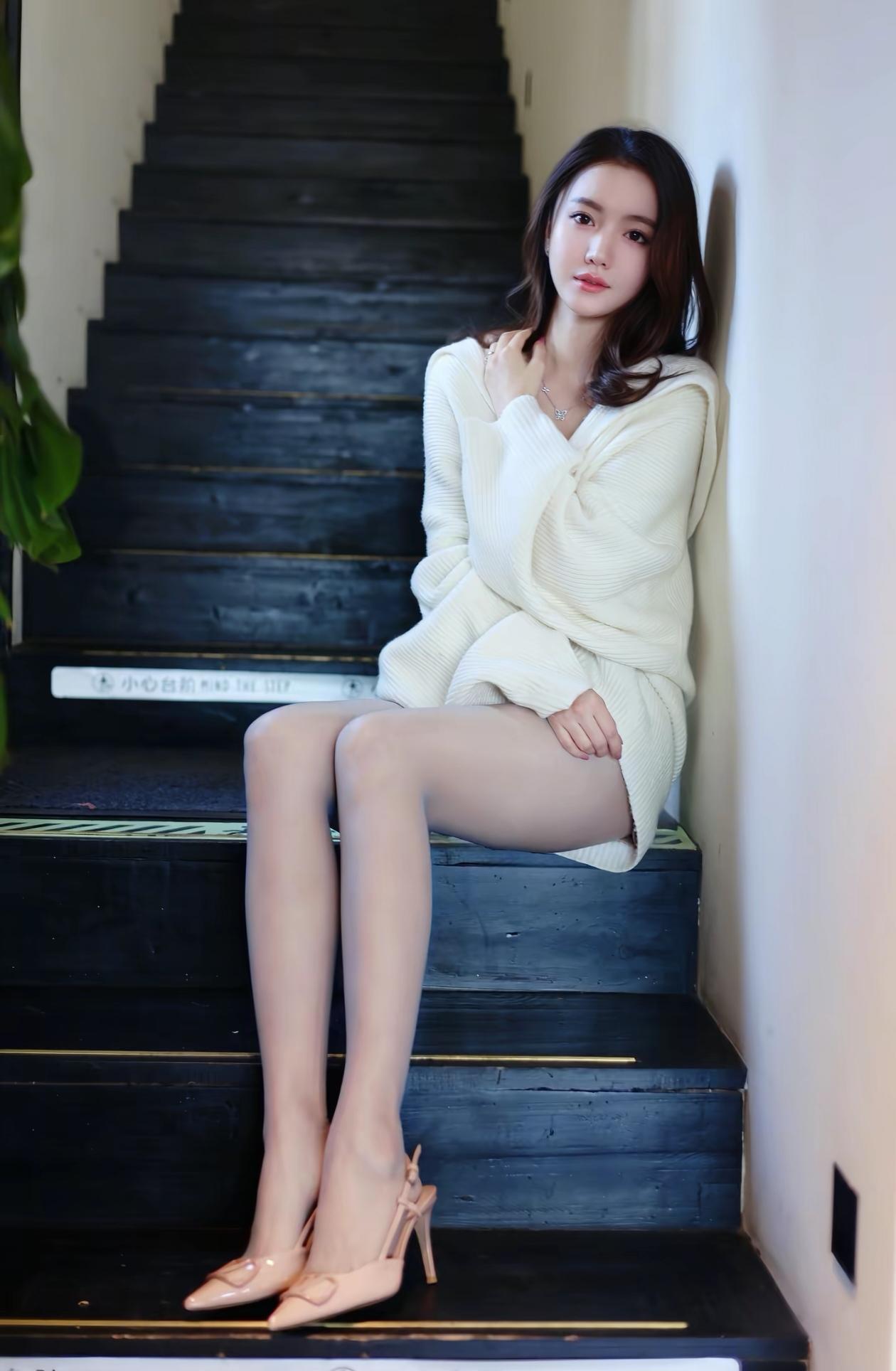 优雅坐楼梯,白裙飘飘,粉色高跟鞋,自然光下更显清新