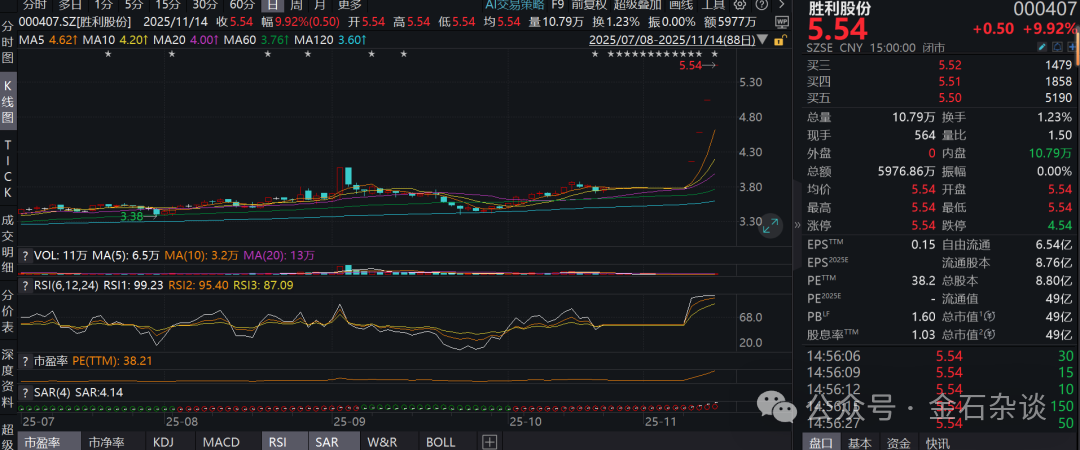 还有股民疯狂炒作胜利股份,目前已5个涨停,这是一家燃气公司,和统一股份一样,除了名字,还有就是盘子极小,容易被爆炒。