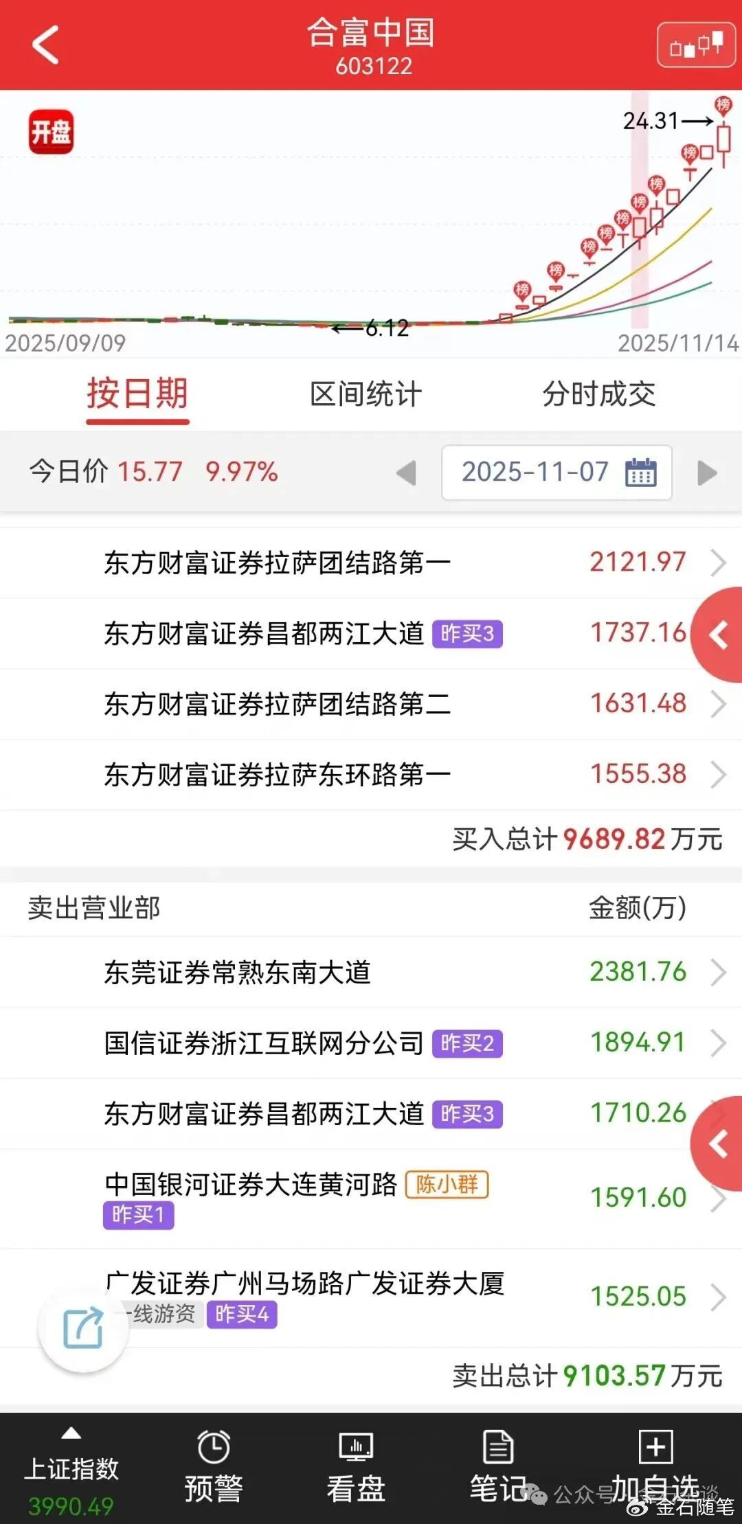 合富中国13天12板,公司主要做体外诊断医疗,包括临床医疗AI辅助,常年盈利几千万,今年前三季度还亏损1239万。股价大涨背后,一是医药股复苏,二是母公司是台湾上市企业,近期资金疯狂炒作海峡两岸指数;三是合富中国,听名字寓意不要太好;四是游资带动,11月6日前后,多位知名游资参与,甚至顶级游资陈小群也疯狂买入,第二日卖出大约1/3。目前买入榜基本都是散户们。