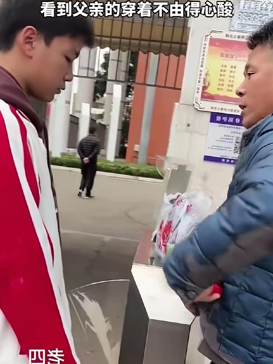 孩子发烧39.5,父亲忙着赶到学校给孩子送药和吃的,并塞进孩子手里50元钱,看到父亲穿的一身衣服,心酸的眼泪不由的流了下来,父亲不是没钱买新衣服,而是把辛苦挣的钱,存起来给儿子留着上学用,,只要儿子好好学习,父亲再苦再累也值了,儿子理解父亲的辛苦甘苦,是对父亲最大的安慰!希望以后孩子学业有成让父亲过上好日子! 穿着差不代表没钱,底层人靠打工挣钱,穿好的可能也觉得浪费,有钱也不愿花在衣服上能穿就行,主要把攒的钱留给孩子用!