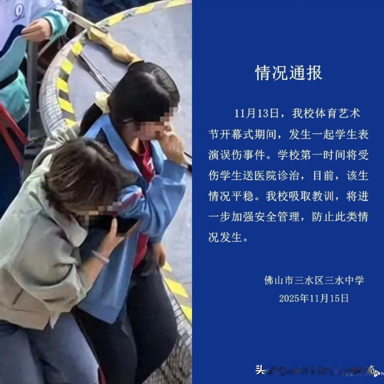 学校射箭表演的箭 竟意外射中女生面部? 这画面想想都疼!佛山三水中学这波“安全警钟”,敲得人心里直打鼓!11月13日体育艺术节开幕式上,射箭表演的箭竟意外射中女生面部,这画面想想都疼!校方凌晨紧急通报,说学生已送医情况平稳,可网友的质疑声却炸开了锅:弓箭表演前到底有没有做足安全评估?器材检查、场地布置、人员培训这些环节,是不是都成了走过场? 要我说,校园安全不是儿戏,别等出了事才想起补漏洞!射箭这种高风险活动,本就该有专业教练全程指导,场地周围还得设隔离带,观众也得保持安全距离。这次是运气好没伤到要害,要是真出了大事,谁担得起责任?射箭伤人 三水中学成人礼 小学生射箭 射箭比赛后遗症 青少年射箭基地 中山射箭 廉江射箭