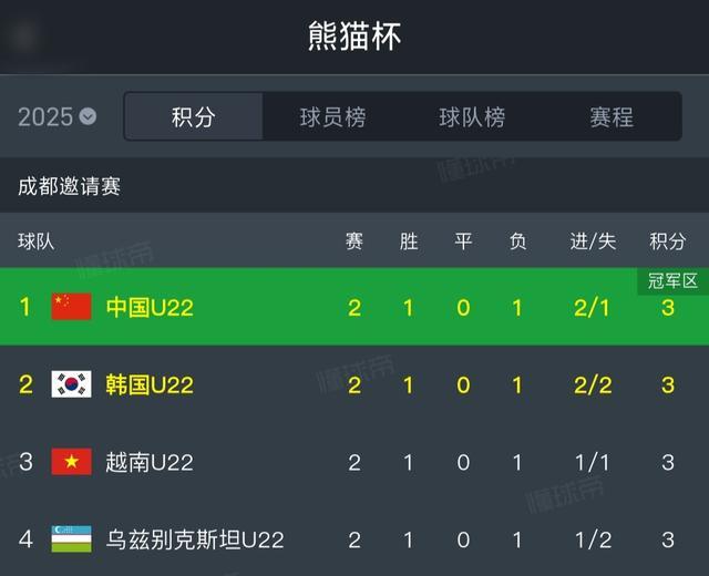 国足战胜韩国登顶熊猫杯积分榜第一!国足(u22)2-0战胜韩国(u22)这样熊猫杯第二轮赛完四支球队各取得一场胜利✌,国足以净胜球优势暂时排名第一,如果国足战胜乌兹别克斯坦队,韩国和越南踢平,国足将获得冠军,如果两场比赛都是平局,国足也是冠军!总之目前四支球队都有机会获得冠军,希望国足战胜乌兹别克斯坦,尽力多取得净胜球争取夺得熊猫杯冠军。