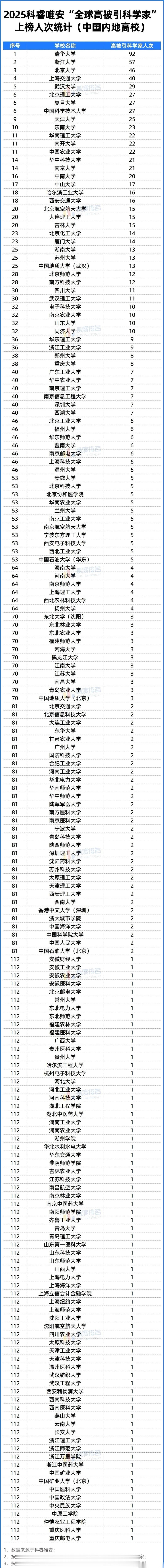 我天,刚看到一个数据,手都抖了。 清华,92个人!全球顶尖科学家那种。 你知道这是什么概念吗?就是旁边的北大(46个)加上浙大(57个),俩王牌加起来,才勉强跟清华打个平手。 这牌桌上,清华自己坐一桌,其他人,另开一桌。 然后你往下看,上交、武大、北理工……也都是响当当的角儿,但那个数字,一下子就掉下来了,断层。 最扎心的是什么? 不是谁第二谁第三。 是后面那长长的名单里,有112所大学,辛辛苦苦一整年,就只有1个人上榜。 一个。 这背后是多少人的灯火通明,是多少实验室里熬红的眼。顶尖的智慧和资源,就是这么残酷地集中在金字塔的塔尖上。 但好玩儿的也来了。 你看南方科技大、西湖大学这些“新来的”,势头特别猛。甚至还有刚成立没几年的学校,也实现了“从0到1”的突破。 这就是咱们现在的科研江湖。 有独孤求败的扫地僧,也有拼了命想挤上华山之巅的后浪。 看着挺残酷,但你换个角度想,这不就是活力吗? 所有人都憋着一股劲儿往上冲。 这股劲儿,才是最值钱的。