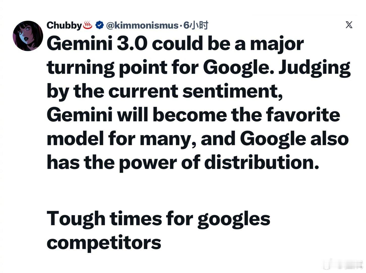 转:Gemini 3.0 可能会成为谷歌的一个重要转折点。Gemini 将会成为许多人的首选模型,而且谷歌还拥有分发优势。谷歌的竞争对手日子不好过了。