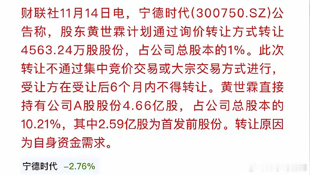 宁德时代的股东黄世霖转让1%的股份。他转让的这1%股份,价值180亿,这次转让股份的原因是自身需要。很多人好奇要买什么需要180亿,这么多钱是很多人好几辈子都赚不到的。人家随随便便的就到手了。黄世霖与董事长曾毓群是高中同学,他们是一起创业的。他的这次套现,让人们觉得宁德时代的股价已经到了最高位了,这很有可能会导致公司的股价波动。股东套现在资本市场还是经常可以见到的,属于股东的个人财务行为,这并不代表着公司的经营恶化的信号。