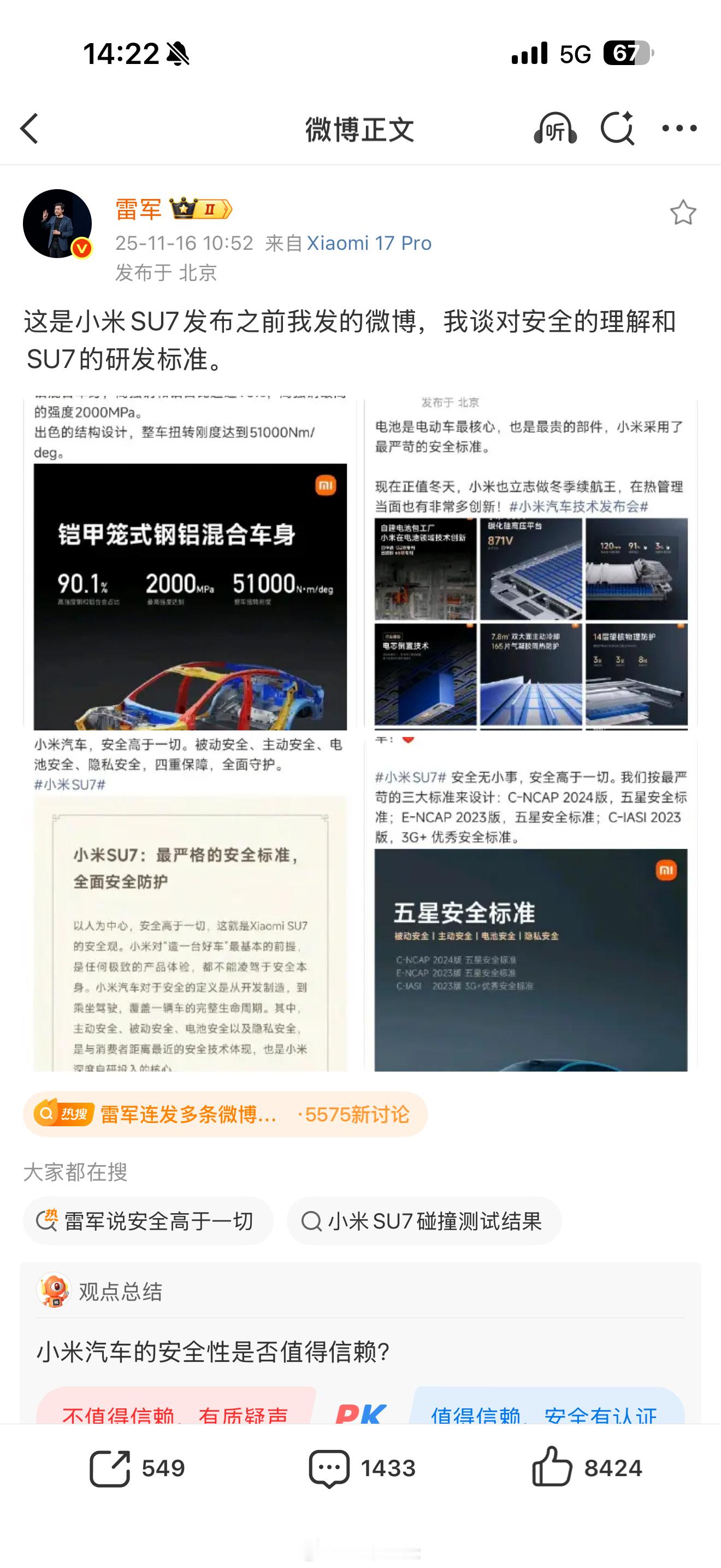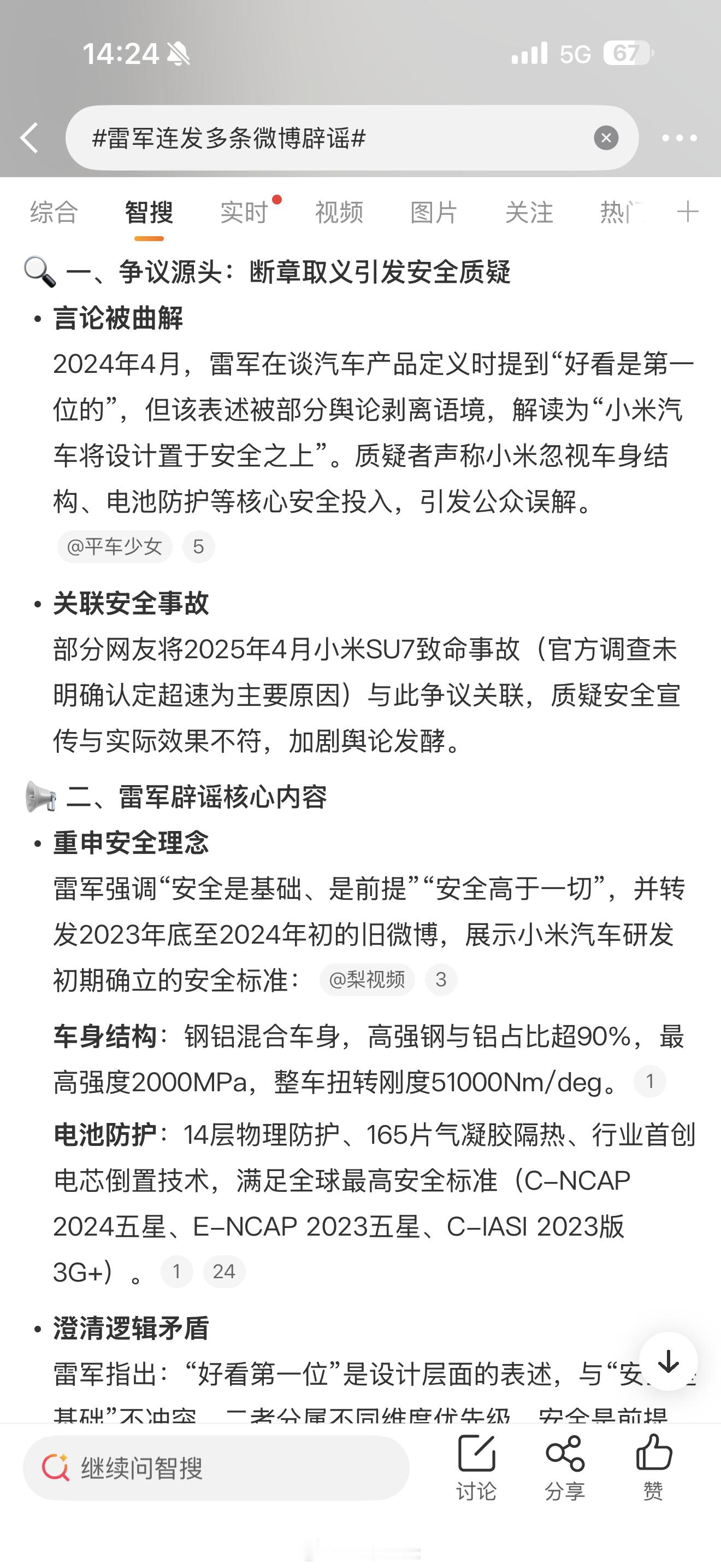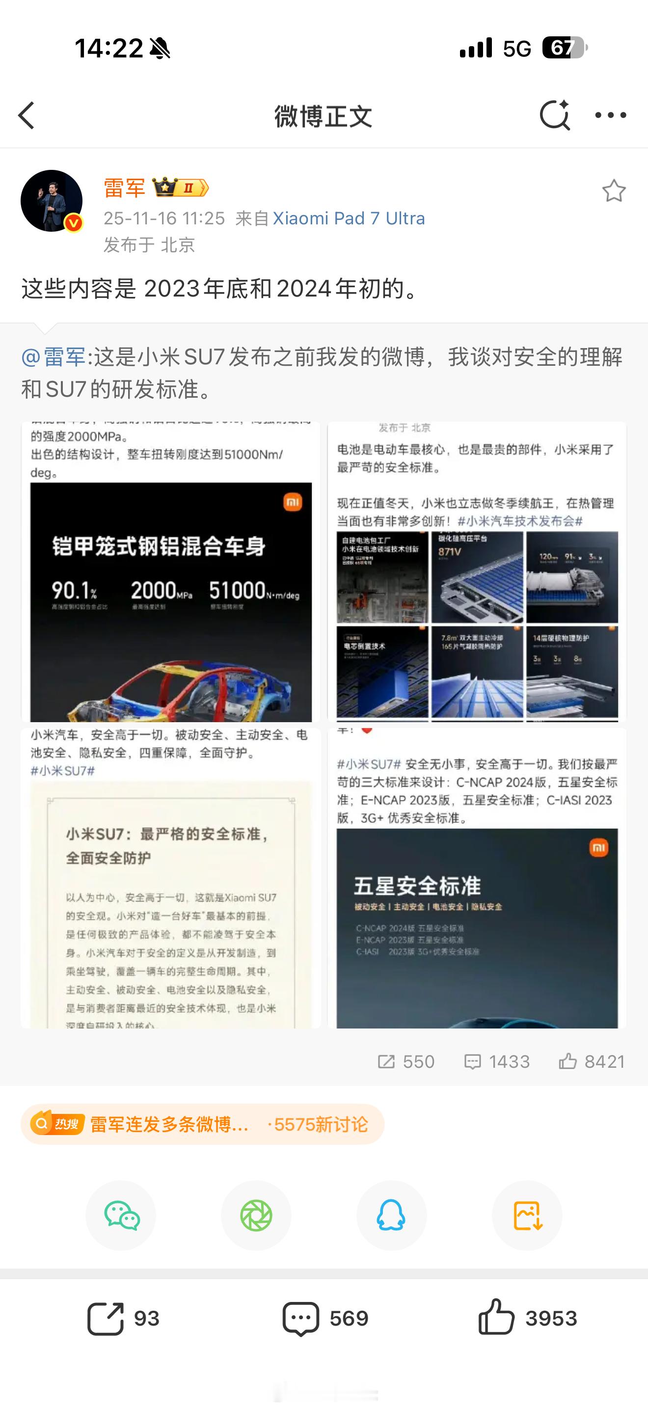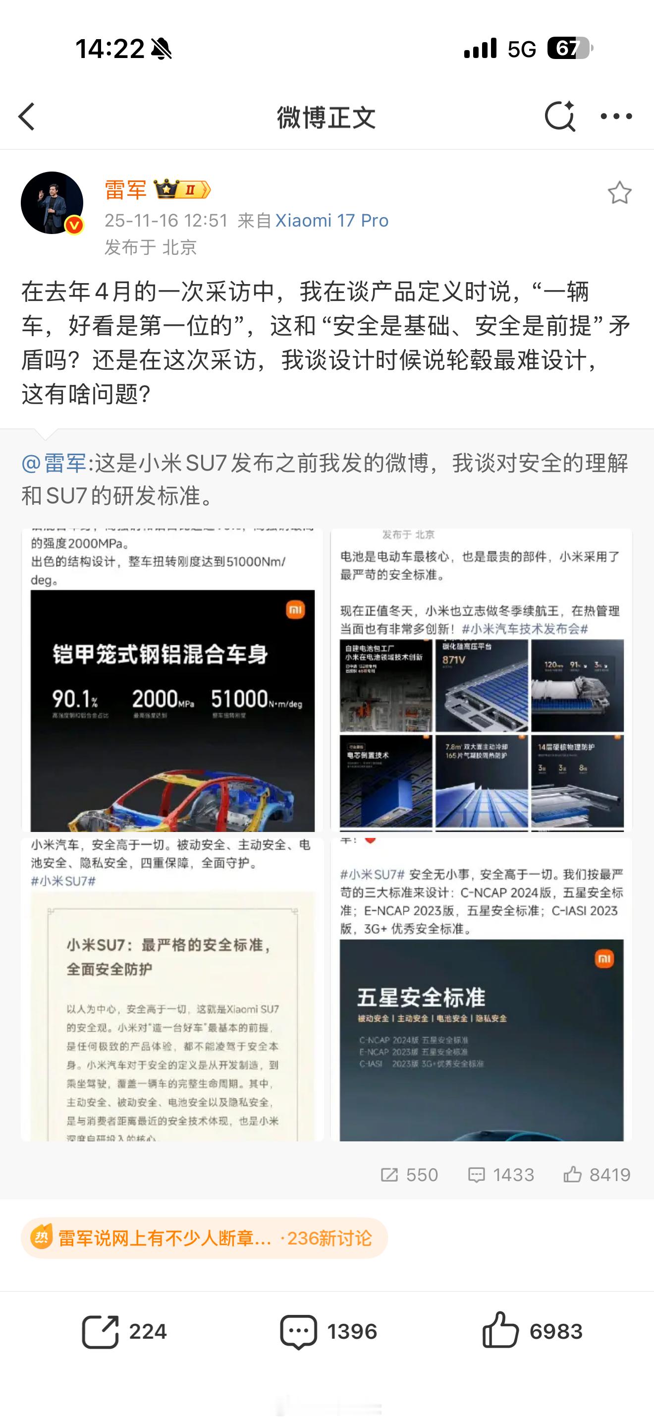 雷总连发三条微博,强调安全是前提,这次是生气了,不过他翻出来了自己过去的言论表明这是误解。其实2018年小鹏汽车也有个类似的事情,何小鹏说“智能汽车的核心在运营而非制造”,引起轩然大波够改口“制造是基础,运营是核心”。