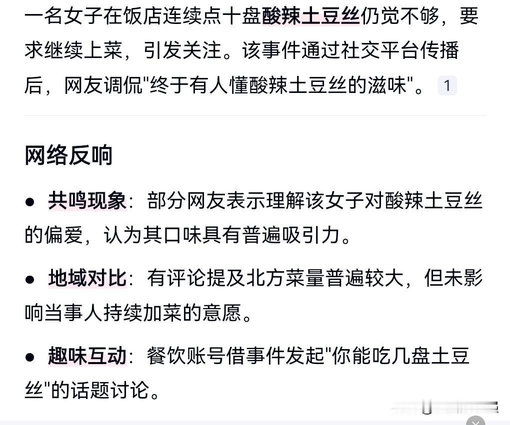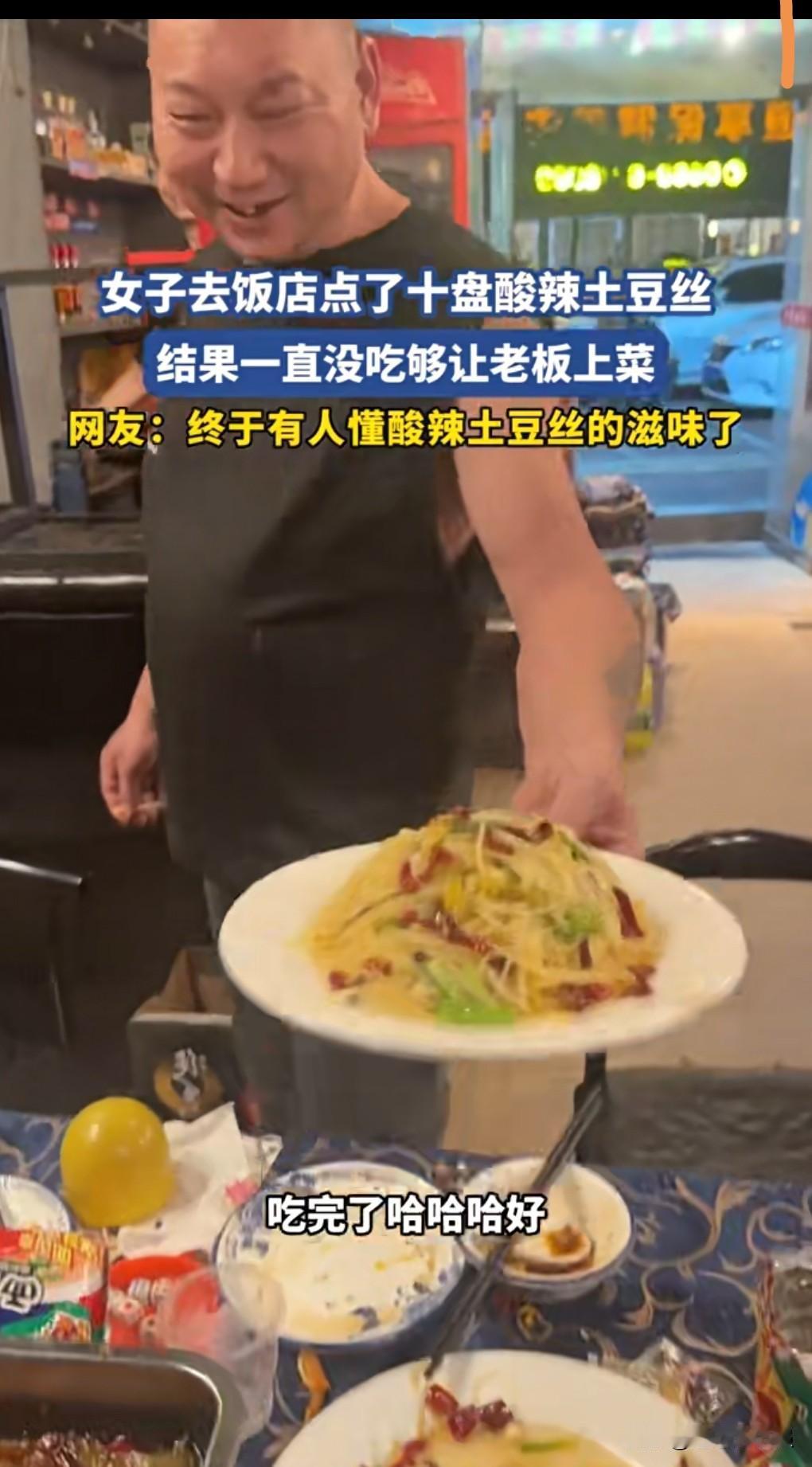 也太让人震惊了吧。 11月16日我我在网上看到这么一个事情。 女子去饭店点10盘酸辣土豆丝没吃够。 怎么这么喜欢吃酸辣土豆丝啊? 竟然点了这么多盘。 这真是个狠人,我算是开了眼了。