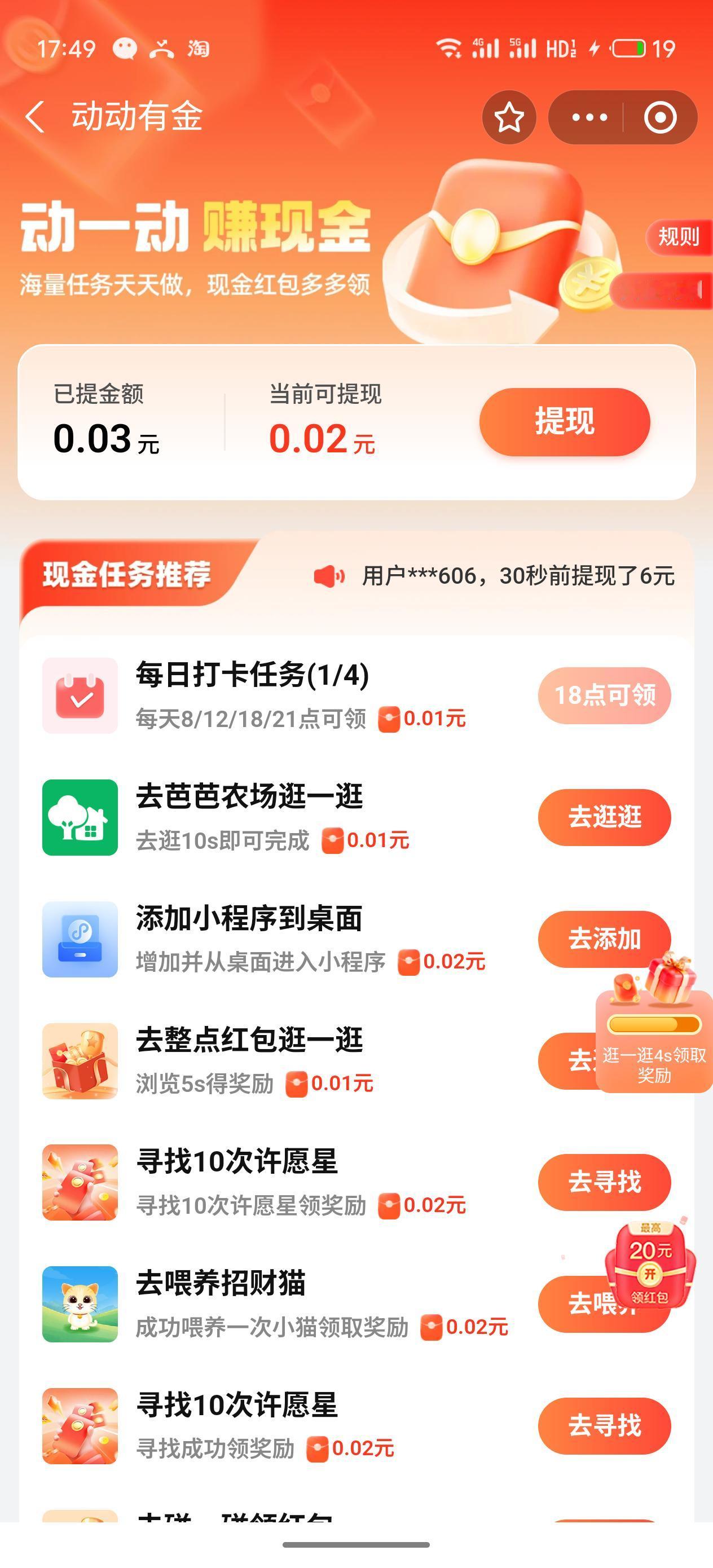 今天偶然刷到了 支付宝里的小程序 运动有金 超简单,点点就把任务做了 提现没有任
