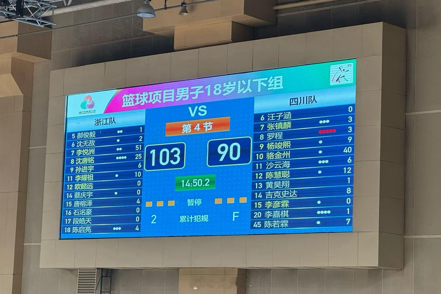 刚结束的一场全运会U18男篮淘汰赛,浙江U18男篮以103比90击败四川U18男篮,浙江的李悦洲独得51分4篮板6助攻,率队打进四强!