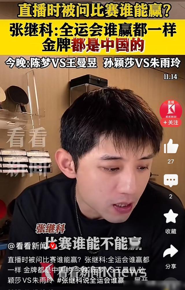 挺有趣,好多网友正在为王楚钦男单半决赛失利而郁闷遗憾, 但又被一段话反复治愈, 挺好玩的。 “别难过,上一次的全运会亚军正在直播间卖鸡爪。” 这话一出来,真是让人会心一笑。 说的就是那位“最快大满贯”得主,前乒乓球世界冠军张继科。 他现在确实常在直播间出现,和当年在赛场上叱咤风云的样子很不一样。 王楚钦这次是输给了樊振东。 都是顶尖高手,输赢本来就在毫厘之间。 东哥实力摆在那里,赢下来也正常。 看比赛的时候就觉得,两人都拼尽了全力。 好几个球打得让人喘不过气。 这种水平的对决,谁赢谁输都谈不上是冷门。 有些粉丝的反应确实有点太大了。 好像输了这场球,天就要塌下来一样。 其实真没必要。 运动员的生涯很长,起起落落太正常了。 张继科当年那么辉煌,现在不也开启了新生活。 在直播间卖货,和网友互动,同样过得挺充实。 这说明人生不止一条路,赛场上的成败,定义不了一个人的全部。 乒乓球是国球,咱们的人才太多了。 内部竞争比国际大赛还激烈。 说白了,这就像自家兄弟关起门来切磋武艺。 不管谁赢,冠军都是中国的。 这就够了。 观众看得过瘾,运动员尽了力,这就是比赛最大的意义。 给比赛附加太多额外的压力,对运动员反而是种负担。 看到他们赛后互相致意,那种惺惺相惜的感觉,挺动人的。 体育精神不就是这样吗? 追求胜利,也尊重对手。 享受过程,而不仅仅是结果。 希望王楚钦能放下包袱。 未来的路还长着呢。 这次输了,下次再赢回来就好。 就像网友说的,别郁闷了,看看前辈们的故事。 人生海海,一场比赛的胜负,真的只是浪花一朵。 MCN双量进阶计划
