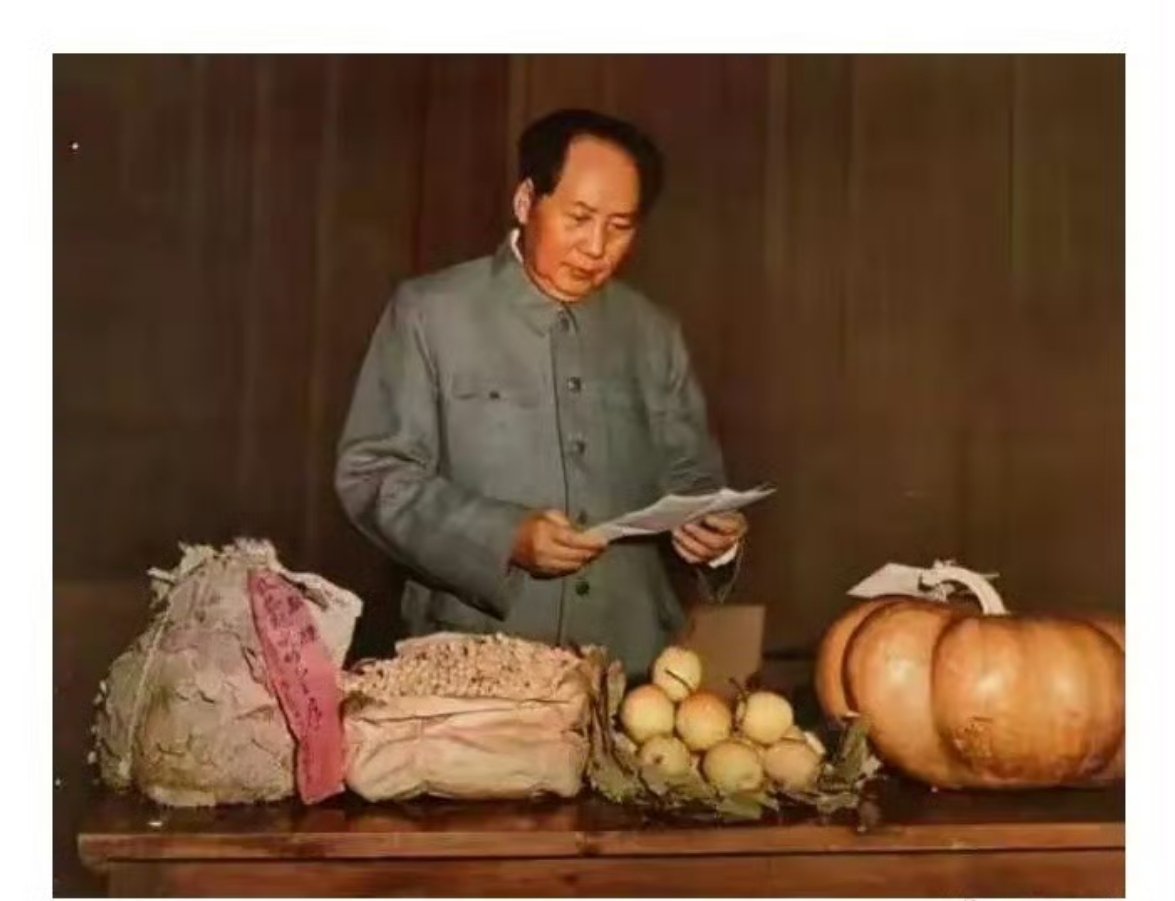 1955年,丰收的人民给毛主席报喜。毛主席正在看报喜信。