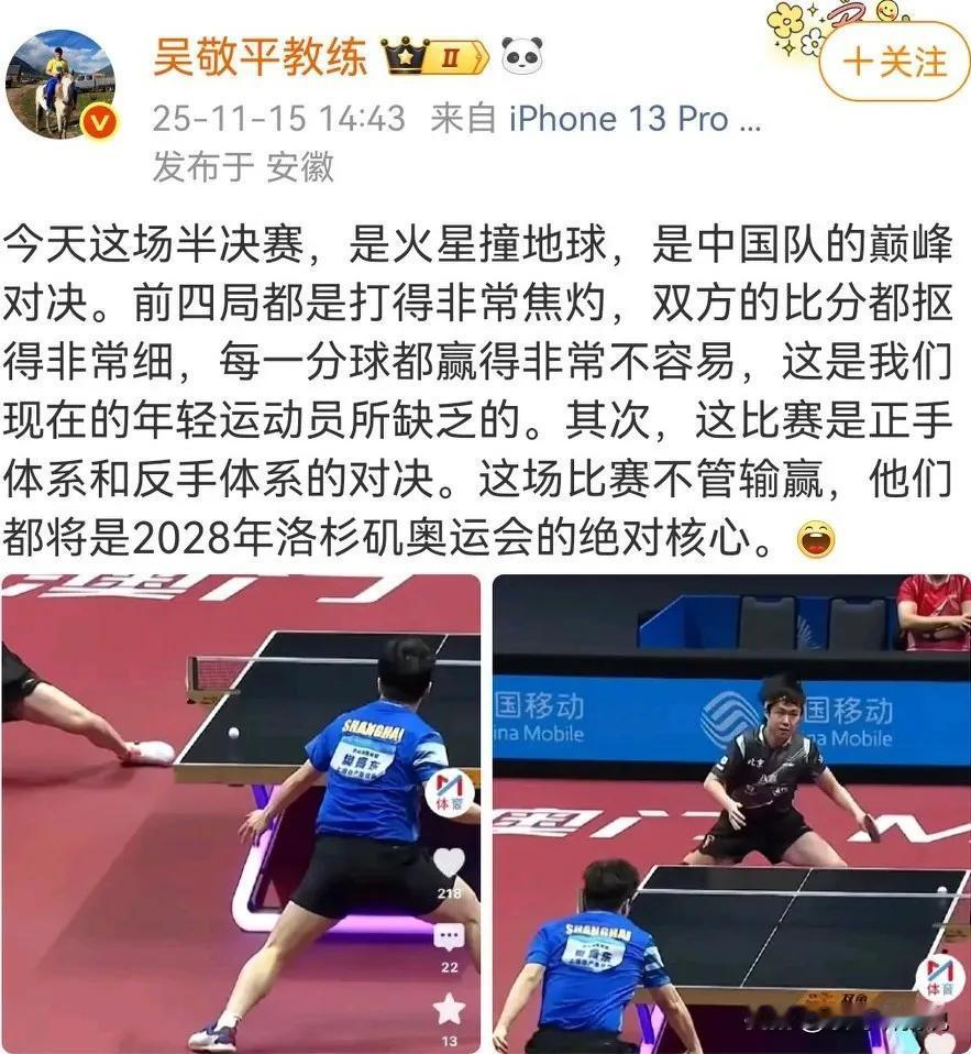 11月16日乒协主席王励勤,在全运会现场观看乒乓球男单决赛樊振东一林诗栋,他怎么想大家不知道,但他想的肯定不少,经过比拼樊振东4一1林诗栋获得冠军。现在樊振东就像王楚钦评价他的一样,觉得东哥比以前更强了,事实证明樊振东更成熟了而且更灵动了,比原来又升华了。吴敬平教练发文说樊振东和王楚钦是洛杉矶奥运会的绝对核心,半决赛樊振东4一2王楚钦,这次吴敬平教练也肯定了王楚钦。 其实樊振东回不回国家队,上不上洛杉矶要看乒协领导和他本人,其他人谁说了也不算,他的竞技状态再超级好,他不想回也没用,他也是有家国情怀的优秀运动员,在非他不可时相信他还是会义不容辞的为国而战。