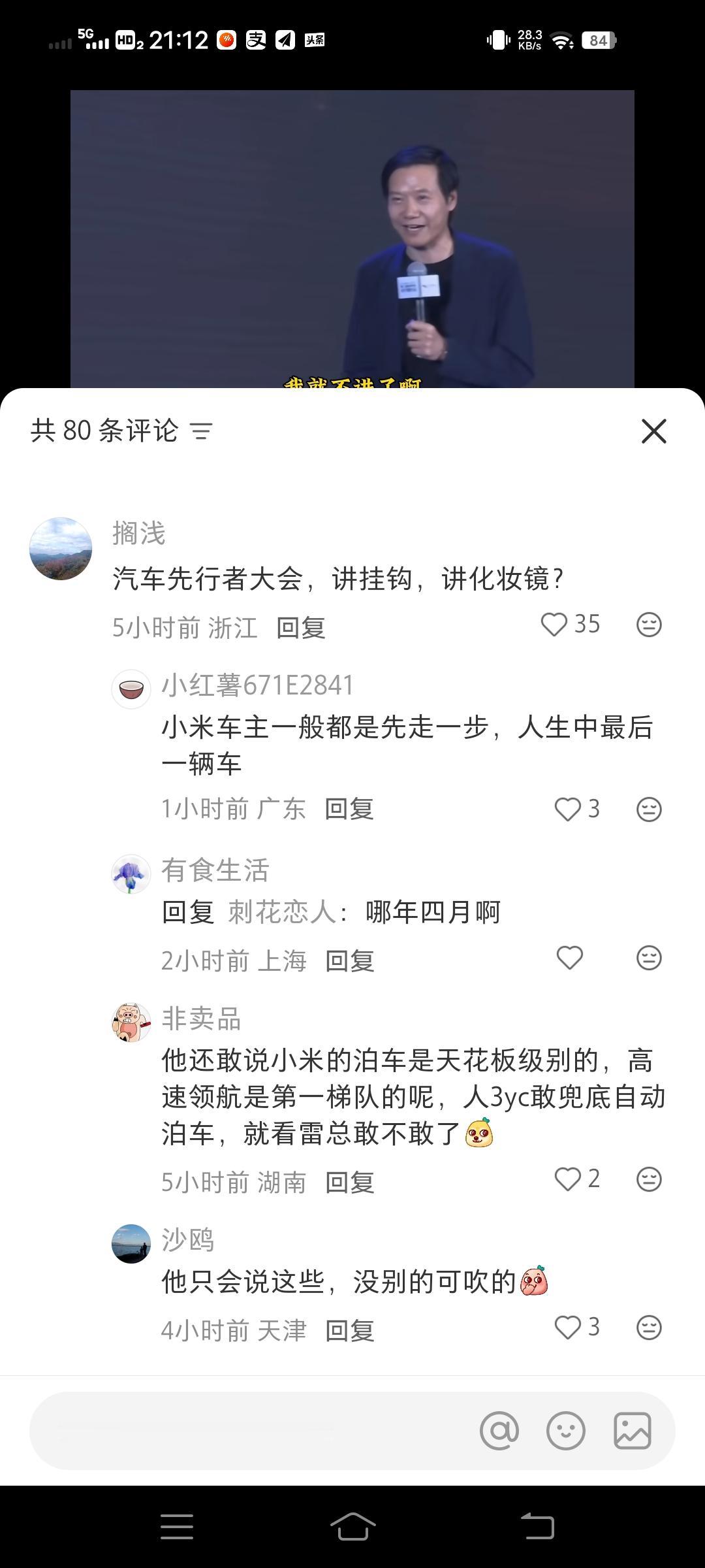 雷总在“第二届未来汽车先行者大会”上是如何介绍小米汽车的各项功能的? 比如这个“化妆镜”,他说他家汽车里面的化妆镜是所有汽车里面最大的,而且还带“色温”,在车内自拍显得皮肤特别好。 还有中控台下面的两个挂钩,这个用户的口碑特别好,主要干嘛呢,你早餐买个豆浆油条、买个螺蛳粉,方便挂。 评论区网友吐槽道:汽车先行者大会,讲挂钩,讲化妆镜?我也是服了雷总了!还有这个化妆镜带“色温”,这个“色温”是什么概念,还从来没听人提出来过,不会是小米首创的吧? 大家怎么看?