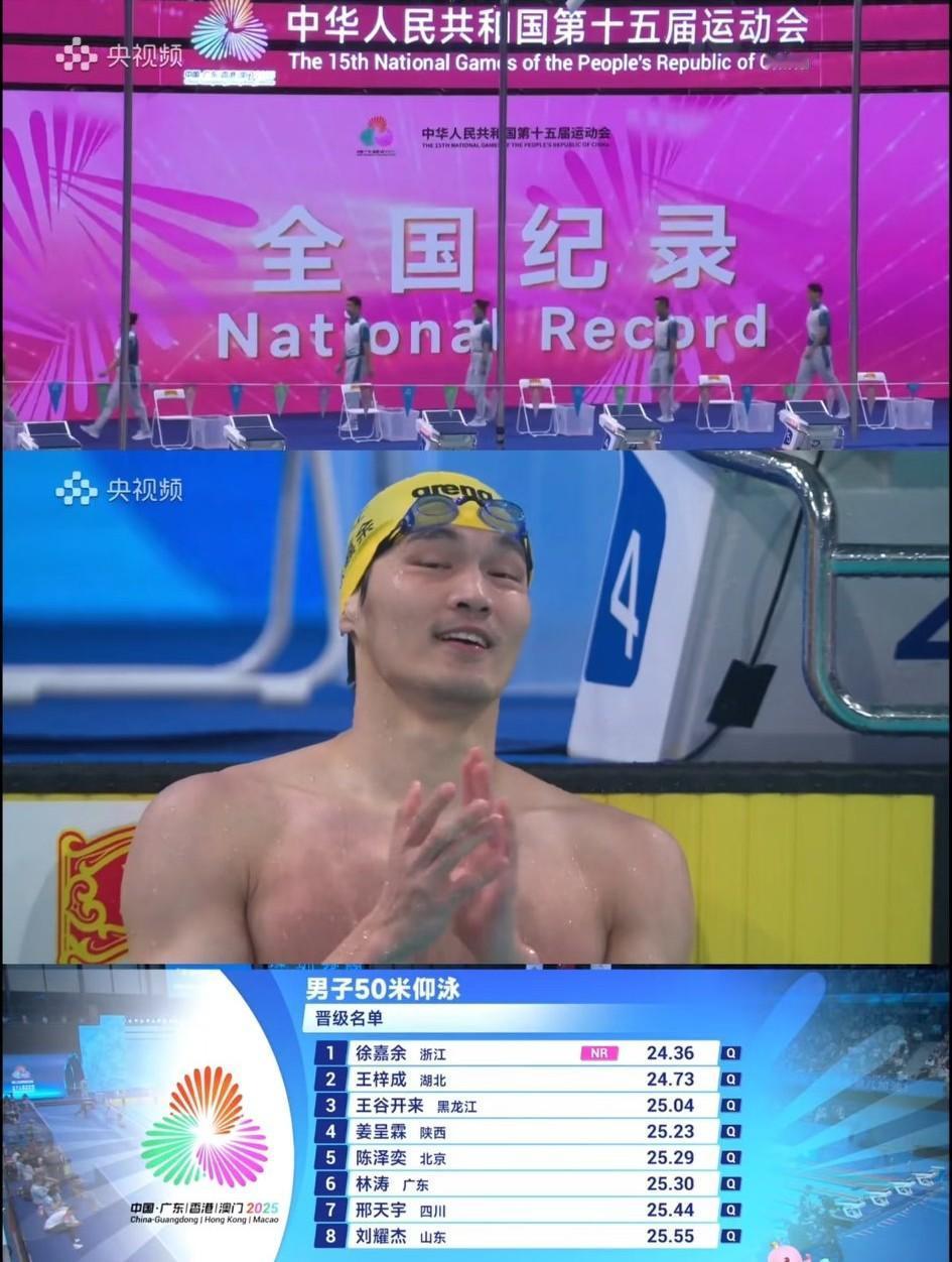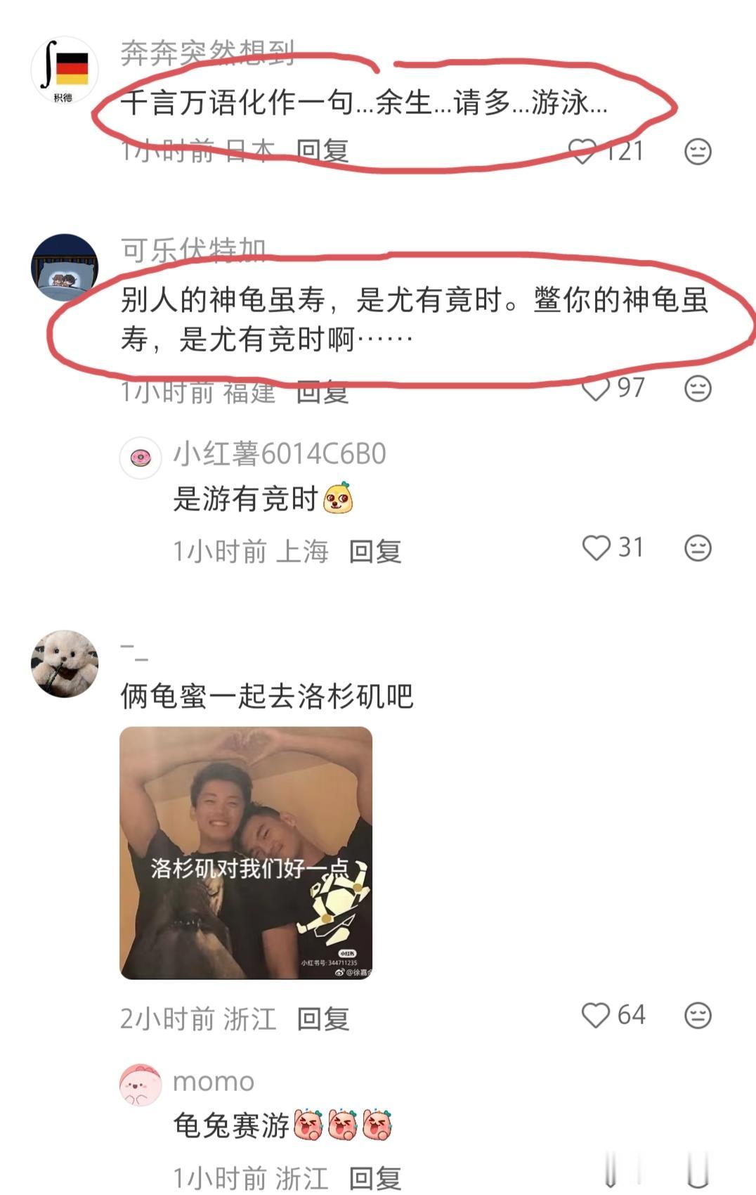 浙江游泳队老将徐嘉余在今晚举行的全运会男子50米仰泳半决赛上,以24″36的成绩刷新了由自己保持的全国记录。 评论区网友的评论真的让我有点啼笑皆非,忍俊不禁!!! “别人的神龟虽寿,是尤有竟时。鳖你的神龟虽寿,是尤有竞时啊” “千言万语化作一句...余生...请多...游泳...” …… 不得不佩服这届网友的才华,曹操的《龟虽寿》既然被他们改成了《鳖虽寿》。而把“竟”字“竞”更是神来之笔! “保重鳖体,就这样一直游到布里斯班”,这句话可能是众多喜欢游泳这项运动,喜欢徐嘉余的网友共同的心声吧!