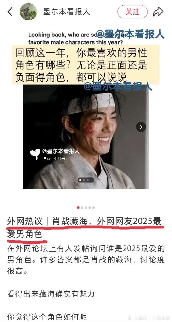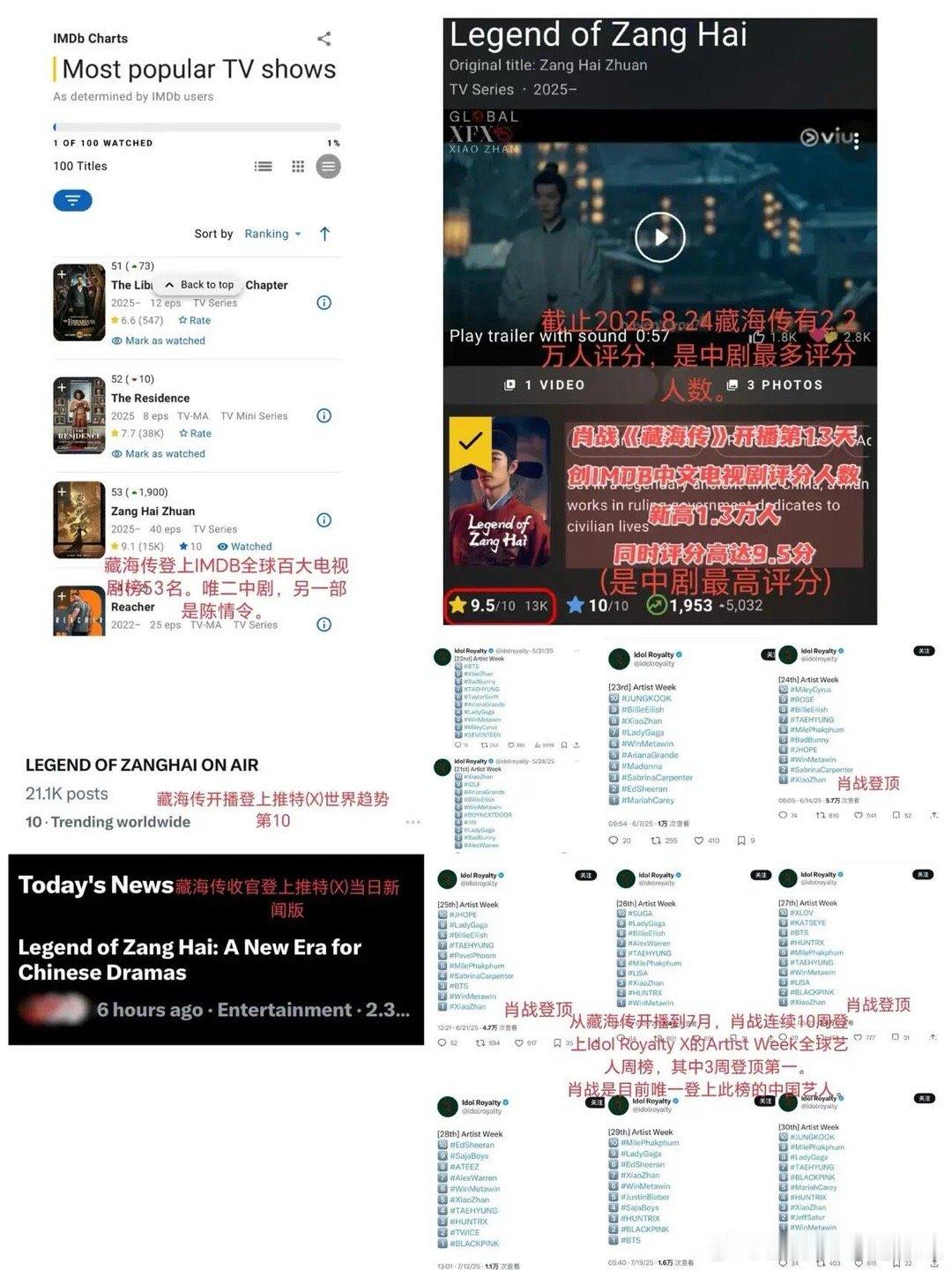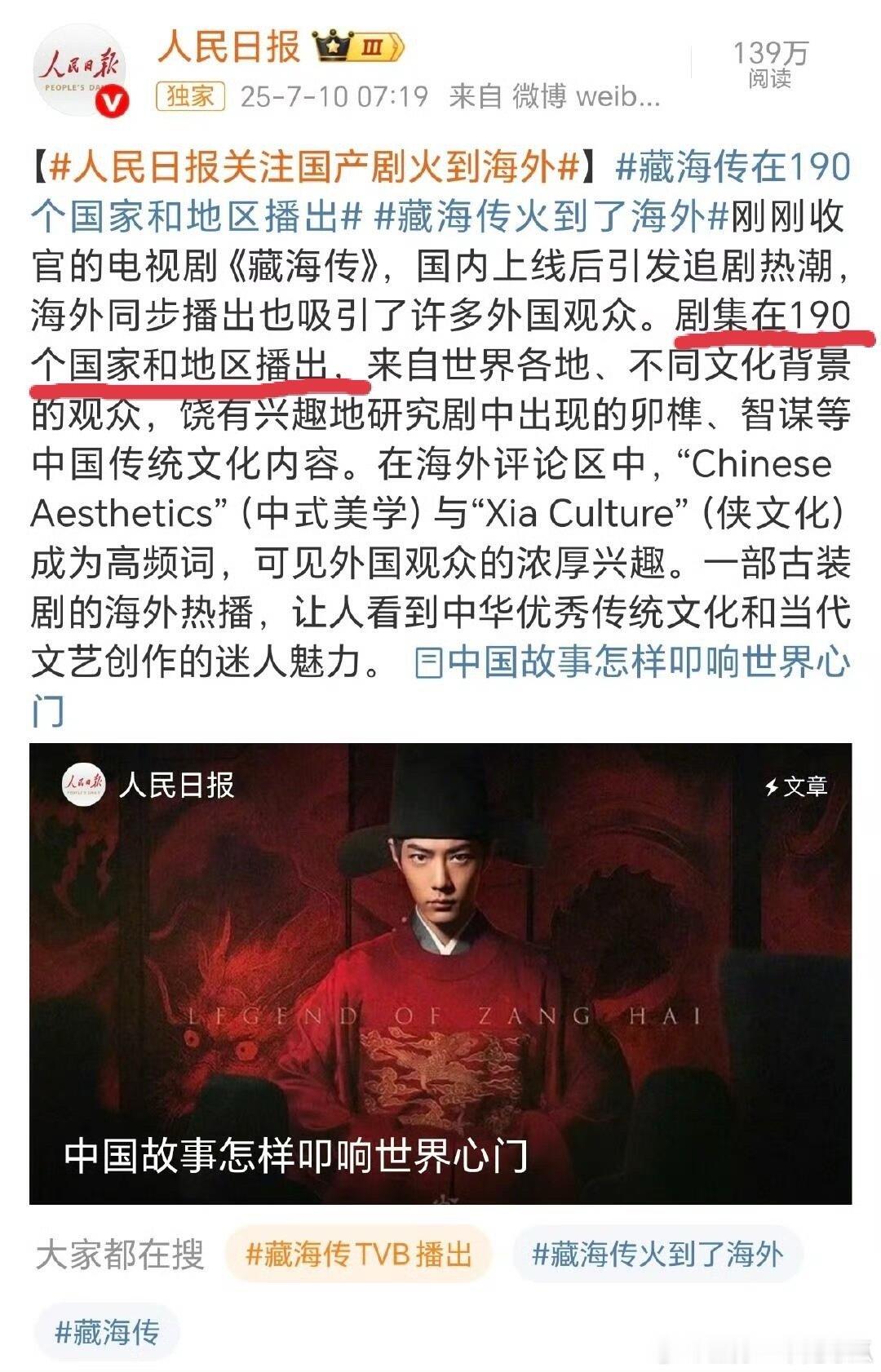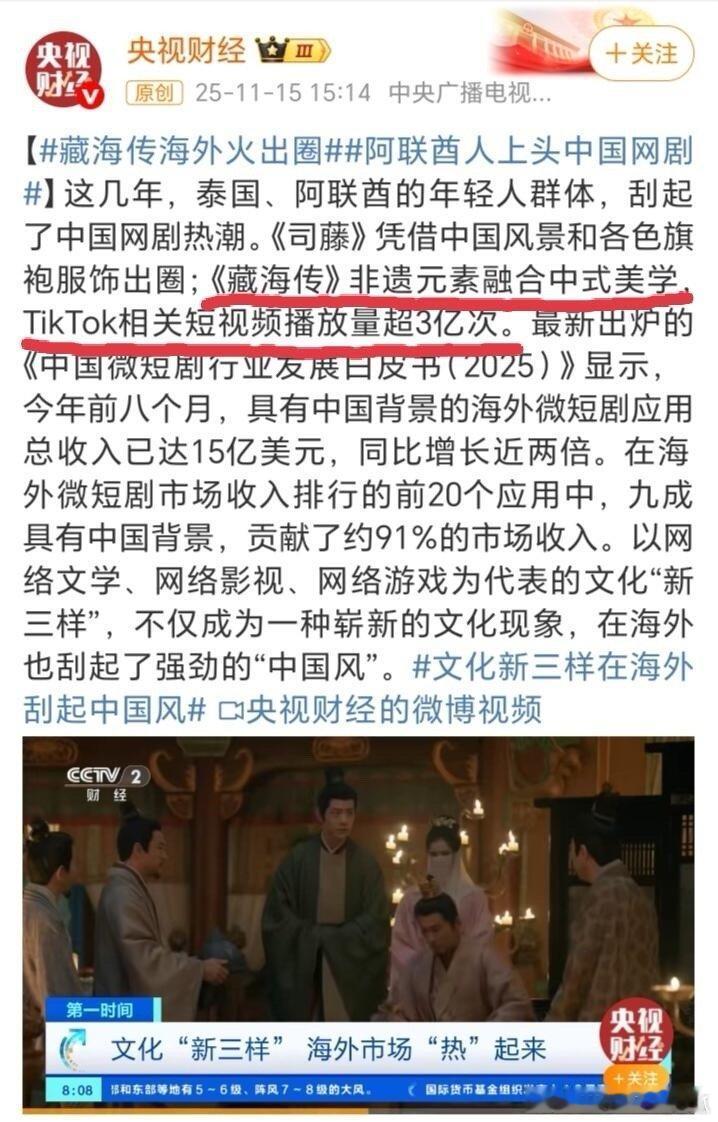 藏海传》海外同样大破圈,好评如潮!1 迪士尼+认证《藏海传》为现象级爆剧;2 《藏海传》在全球190个国家和地区播出; 3 《藏海传》非遗元素融合中式美学,TikTok相关短视频播放量超3亿次; 4 肖战饰演的藏海成为外网网友2025最喜欢的男性角色; 5 《藏海传》台词被海外网球迷引用,大破圈到海外体育圈;6《藏海传》唯二两部入选全球百大电视剧榜的中剧(另一部是《陈情令》),IMDB中剧最高分9.5分!