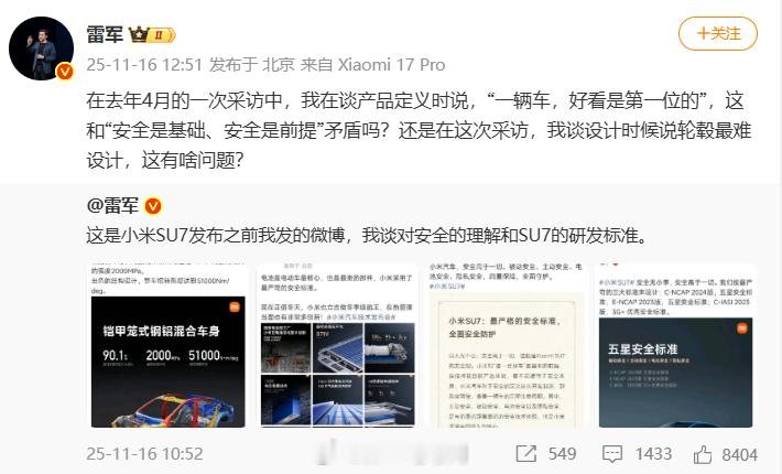 雷军今天在微博密集发声,核心就一个:小米汽车,安全是绝对的底线。雷总还找出2023 年底和 2024 年初所发布内容,他还提到“网上有不少人断章取义、歪曲抹黑”。把安全放在所有智能和性能之前。看来小米这次是想彻底打消大家对造车新势力安全性的疑虑。