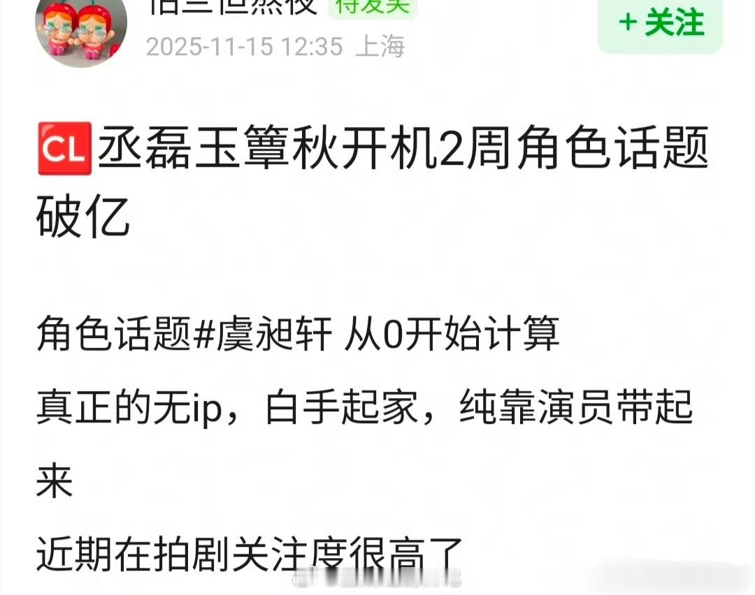 🆑丞磊《玉簟秋》开机2周角色话题破亿🎉