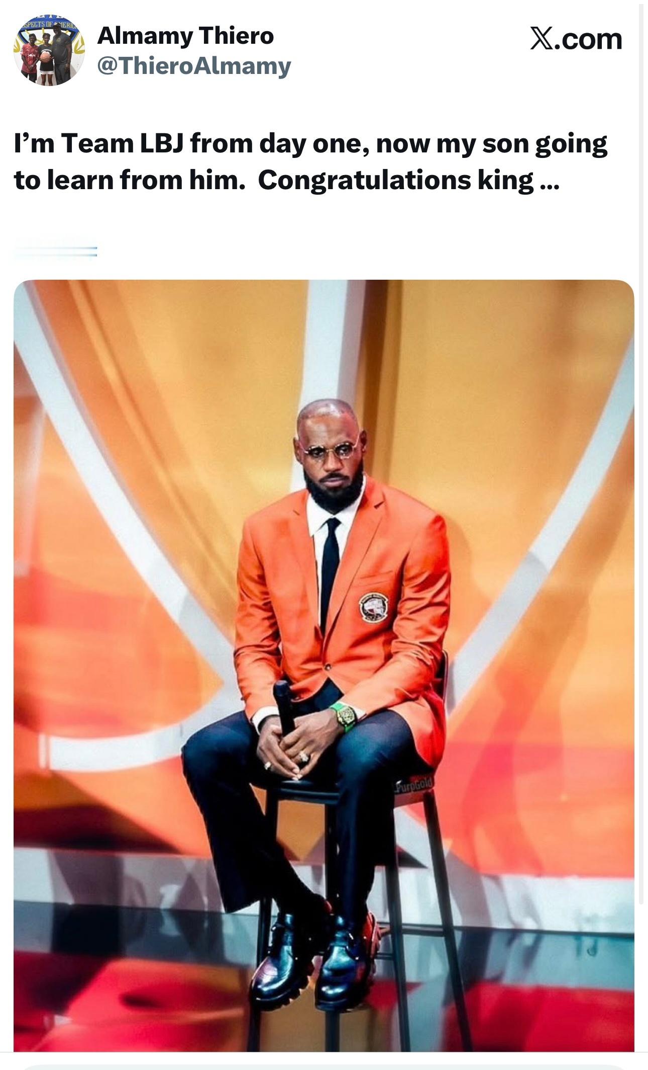 阿杜·蒂耶罗的父亲阿尔玛米居然也是詹姆斯的球迷,詹姆斯以梦八球员身份入选名人堂时