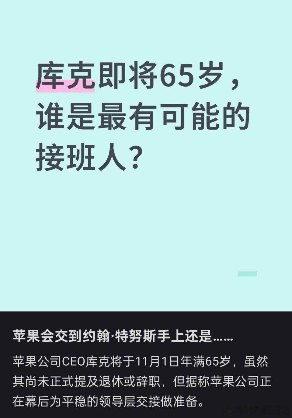 库克即将65岁退休,谁是最有可能的接班人?有传闻50岁的特努斯是美国科技巨头苹果公司最有可能的接班人,但他的方向是技术,一般来说,成熟的科技企业职业经理人都倾向于擅长供应链的当CEO,或许苹果公司没得选了?