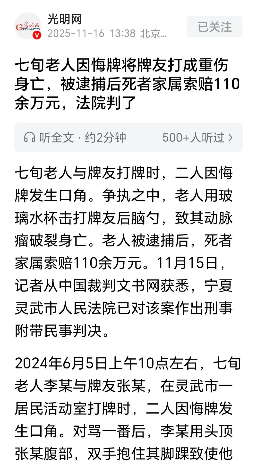 一场牌桌口角,酿成两条人命的悲剧!宁夏七旬老人李某因牌友张某悔牌,争执中用玻璃水杯砸击对方后脑勺,致张某脑内动脉瘤破裂身亡。死者家属索赔110余万元,法院最终以过失致人死亡罪判处李某有期徒刑1年6个月,仅支持6.8万元赔偿,物业公司无责。 一、牌桌酿血案:一张牌的冲动,两个家庭的毁灭 咱们平时打牌下棋,图的就是个乐呵,偶尔拌两句嘴也正常,可谁能想到,宁夏这两位老人能把小事闹到出人命的地步! 2024年6月5日上午10点,灵武市一个小区的居民活动室里,70多岁的李某和牌友张某正玩得兴起。没成想,张某打牌时悔了一步牌,这一下可把李某惹急了——打牌的人都知道“落子无悔”,但也犯不上动真格啊!可李某当场就炸了,两人你一言我一语吵起来,越吵越凶,很快就从嘴仗升级到动手。 李某先是用头顶撞张某的肚子,还伸手抱住张某的脚踝,硬生生把人掀得后仰倒地。张某起来后也没服软,还手之后想着“惹不起躲着走”,转身就想离开活动室。可李某还没消气,看到张某要走,顺手抄起桌上的玻璃水杯,朝着张某的头部右后侧狠狠砸了过去!这一下力道真不小,张某的头当场就流了血。 受伤后的张某撑着报了警,可刚走出活动室门口,就一头栽倒在地昏了过去。警察赶到后赶紧打了急救电话,张某被先送到灵武市人民医院,后来又转去宁夏医科大学总医院抢救,可病情一直没好转。当天18点多,家属收到病危通知书,实在没办法放弃了治疗,到了20点,张某就不幸离世了。 谁能想到,就因为一张牌的争执,一个丢了性命,一个要蹲监狱,两个原本平静的家庭,就这么彻底毁了。 二、法律拆解:1年6个月刑期+6.8万赔偿,到底咋来的? 案件判决一出来,网友们直接吵翻了:“砸死人只判1年6个月?这也太轻了吧!”“110万索赔只给6.8万,家属能接受吗?”其实这不是“轻判”或“少赔”,背后全是法律的严谨考量,咱们用大白话讲清楚。 先说说:为啥是“过失致人死亡罪”,还只判1年6个月? 很多人觉得,拿着玻璃水杯砸后脑勺,这明显是故意伤人,怎么会定“过失”?还只判1年6个月?这里要分清两个关键罪名:故意杀人罪和过失致人死亡罪。 故意杀人罪是啥?就是行为人心里明明白白想让对方死,比如拿着凶器往致命部位猛打,不计后果。但过失致人死亡罪不一样,行为人根本没有杀人的想法,要么是疏忽大意没料到会出人命,要么是过于自信觉得自己的行为不会造成死亡结果。 回到案子里,李某就是典型的“过于自信的过失”。他因为牌桌冲突一时冲动动手,目的是发泄不满,不是要杀死张某。他可能知道砸人会受伤,但绝对没料到张某脑内有动脉瘤,这一砸会引发破裂致死。如果他真有杀人意图,就不会只是冲动之下用水杯砸一下,而是会有更致命的行为。 根据《刑法》第233条,过失致人死亡罪情节较轻的,处3年以下有期徒刑。法院考虑到李某没有积极赔偿,也没取得家属谅解,所以不适用缓刑,最终判了1年6个月,这完全符合法律规定,不是“轻判”,而是精准定性后的合理判决。 再说说:110万索赔为啥只支持6.8万?物业公司为啥无责? 死者家属索赔110多万,包括医疗费、死亡赔偿金、丧葬费等,还把物业公司也告上了法庭,可最终只拿到6.8万赔偿,物业公司也不用担责,核心原因就两个: 第一,因果关系不是“全责”。经宁夏法庭科学司法鉴定中心鉴定,张某本身脑内就长有动脉瘤,李某的击打是导致动脉瘤破裂的诱因,属于“辅助死因”,不是唯一死因。简单说,张某的死亡是自身疾病和外力击打共同作用的结果,不能让李某承担全部责任。就像之前有个类似案例,邻里冲突诱发对方脑血栓,法院也是按过错程度让侵权人承担部分责任,不是全额赔偿。 第二,刑事附带民事诉讼的赔偿范围有明确限制。很多人不知道,刑事附带民事诉讼和单纯的民事诉讼不一样,它只支持“实际发生的物质损失”,像死亡赔偿金、精神损害抚慰金这些带有精神补偿性质的费用,法院是不支持的。家属索赔的110万里,大部分都是死亡赔偿金这类不被支持的项目,自然没法全额满足。 那6.8万是啥?主要是张某抢救期间的医疗费、丧葬费这些实际花出去的钱,是法律规定范围内能支持的全部费用。有律师也说,现在刑事附带民事诉讼里,受害方很难拿到高额赔偿,因为残疾赔偿金、死亡赔偿金这些都不支持,就算索赔金额再高,法院也只能按实际物质损失判。 至于物业公司被免责,也很合理。活动室是正常开放的,冲突是突发的、谁也没料到的,物业公司没有未尽到安全保障义务的情况,总不能让物业公司为每个人的冲动行为买单吧? 最后想问大家:你觉得这1年6个月的刑期和6.8万的赔偿合理吗?如果遇到牌桌冲突,你会怎么处理?要是你是死者家属,能接受这样的判决吗?欢迎在评论区留下你的看法,一起聊聊身边的法律小事!