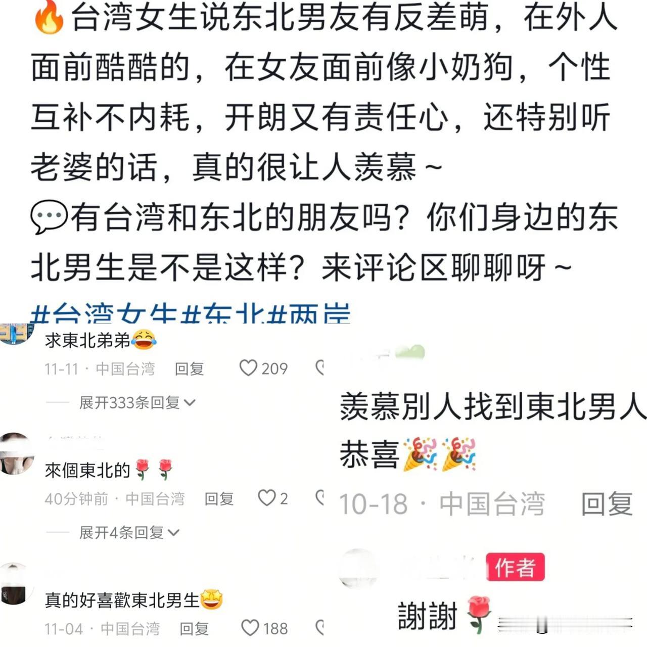 最近看到好多台湾省同胞,找东北对象的视频,一位台湾美女主,谈到喜欢东北人的原因。 评价很正面:东北人不磨叽不BB,不打小作文,不斤斤计较,非常豪爽不AA,来哈尔滨感受到东北人的书香气,爱读书,爱音乐,人高马大,却能对女生特别温柔,与生俱来的尊重女性。 作为东北人看到这样的评价,心里太暖了,欢迎台湾省同胞来东北玩。