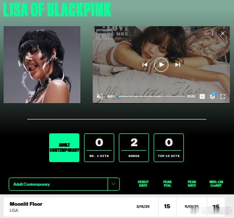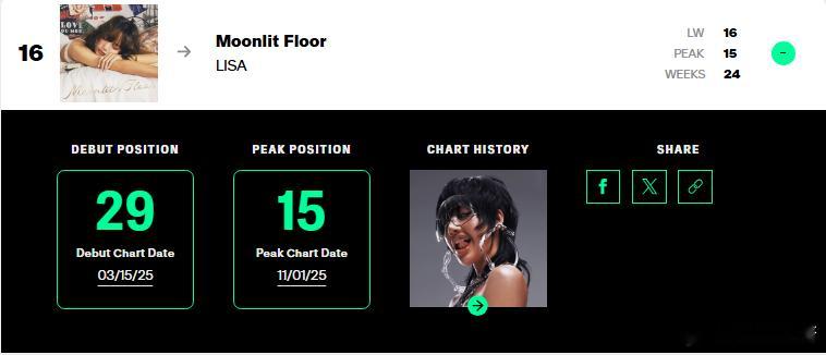 | Lisa的《Moonlit Floor》成为Kpop艺人在Billboard Adult Contemporary排行榜上停留时间最长的歌曲,累计在榜24周。 该曲于2025年3月15日以第29名首次入榜,11月1日攀升至第15名的峰值,目前位列第16名。