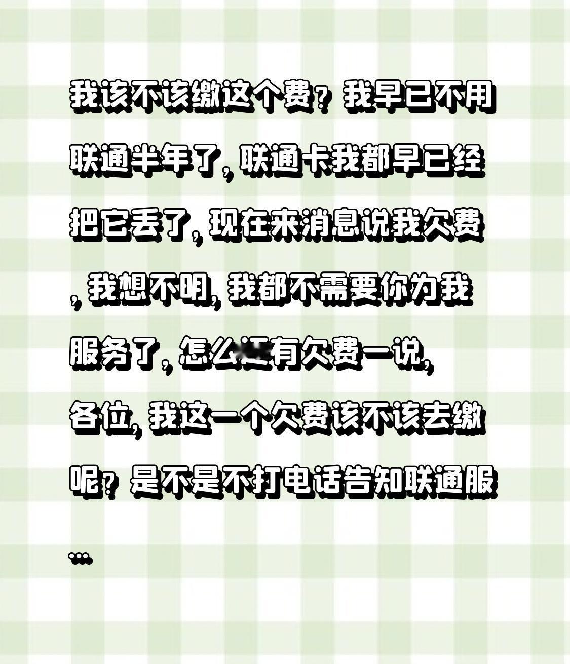 我是否该缴这笔费用? 我停用联通卡已有半年之久,卡也早就扔掉了。 如今却收到欠费通知。 我实在想不明白,我都不再需要联通的服务了, 怎会还有欠费情况? 各位,我这笔欠费到底该不该缴呢? 是不是如果不打电话告知联通服务台自己要停卡停机,就会一直产生月租费用,会一直存在出现欠月租的情况呢?