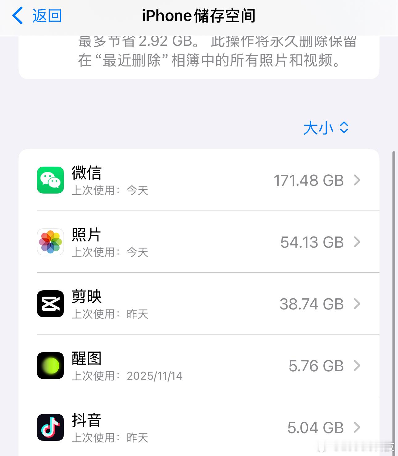 设置 → 通用 → iPhone存储空间 → 选择应用 → 删除应用(彻底清除数据)!这种清理正确!不过,我现在的手机空间占据最多的还是微信