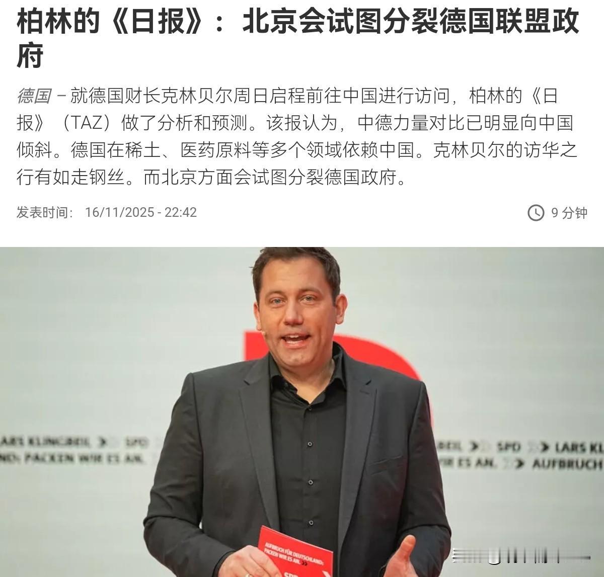 德媒点名对我们进行批评!德媒声称,中国正试图“分裂”德国联盟政府!11月17日,根据柏林《日报》报道,德媒称,中德力量对比已明显向中国倾斜。德国在稀土、医药原料等多个领域依赖中国。克林贝尔的访华之行有如走钢丝。而北京方面会以此试图“分裂”德国政府。为什么德媒得出这种判断呢? 德媒表示,德国外长瓦德富尔取消访华行程之后,带来一系列连锁反应,德国总理默茨计划在十月底对北京进行首次访问,但该行程仍停留在规划阶段。中国外交官愈发自信、强势,而且口径高度一致。而如今,首位访华的竟是社民党籍财长克林贝尔,而基民盟籍出身的外长和总理。而克林贝尔不得不在台湾问题上谨小慎微。 对于德媒的这一批评,我们怎么看呢?说实话,德国自己的外交政策出了问题,却指责我们试图“分裂”德国政府,这非常的荒唐。说到底,德媒认为,德国政府官员一方面可以在台湾问题胡说八道,丝毫不用考虑我们的感受,另一方面,又要在符合德国利益的领域跟我们谈合作。似乎在德媒的字典里面,完全不存在平等和尊重这样的字眼。 对于德媒的内政问题,我们没有丝毫的兴趣,我们从不干涉他国内政。因此,德国也绝对没有理由干涉我们的内政。德国联合执政的各政党对华态度存在差异,而怎么在对华问题上形成一致立场,这是德国政府需要解决的问题。因此,德媒批评我们完全站不住脚,德媒不能自己生病,而要我们吃药,这无疑非常的荒唐。