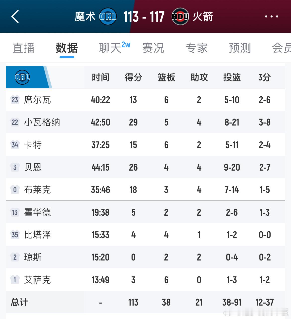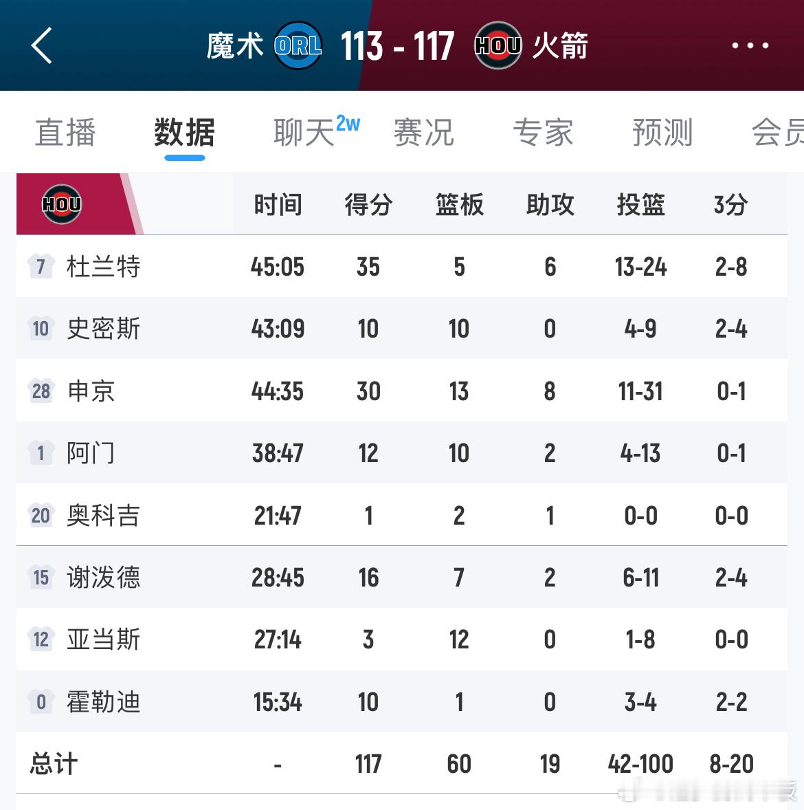 火箭117-113加时战胜魔术杜兰特35分5篮板6助攻,申京32分12篮板8助攻;小瓦格纳29分5篮板,贝恩26分
