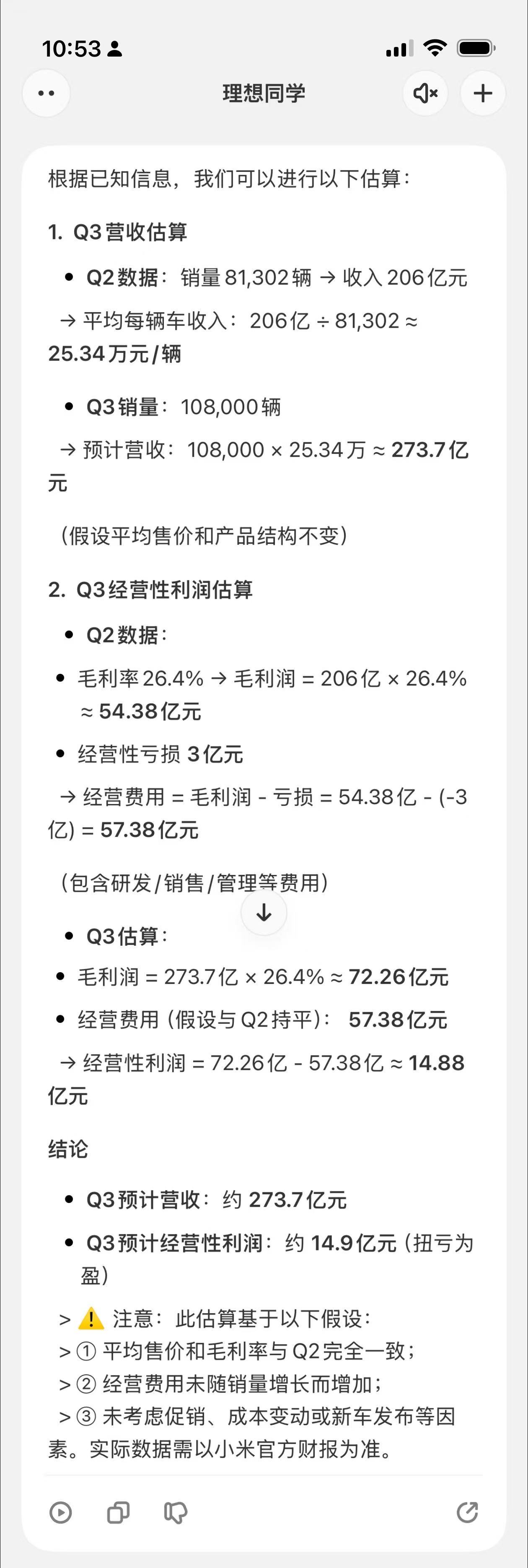 小米明天财报,汽车业务会不会盈利?已知小米汽车 Q2 销量 81302辆,收入人民币 206 亿元,经营性亏损 3 亿元,毛利率约 26.4%,如果Q3 销量 108000辆,毛利率保持不变,那小米汽车 Q3 的营收大概会多少,经营性利润会是多少?