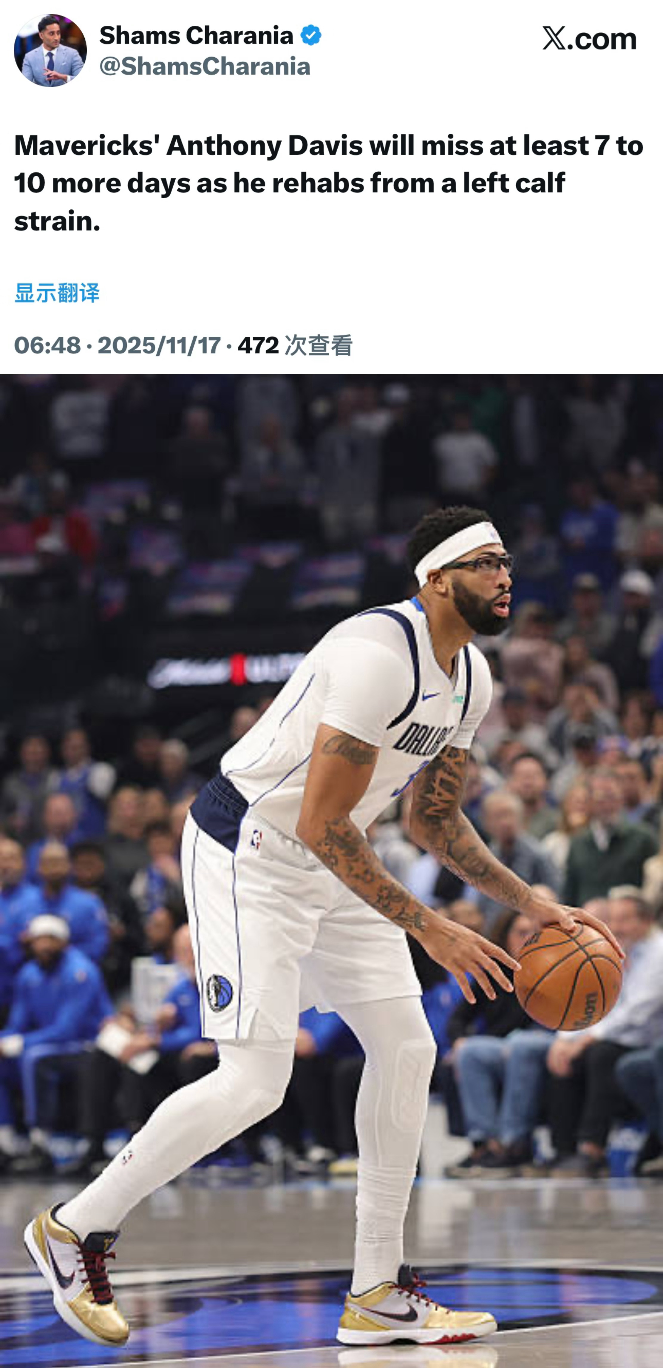 安东尼·戴维斯因左小腿拉伤正在康复,将至少再缺席7到10天。自从10月30因伤退