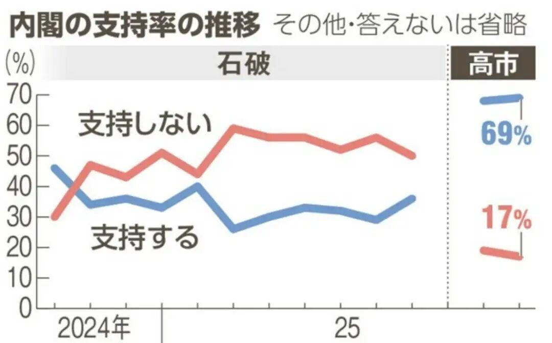 高市早苗11月7日在国会备询时,暗示日本可能武力介入台海,“台湾有事”言论引发中日紧张关系急剧升温。执政的自民党代理政调会长田村宪久周日透露,高市“在反省没有充分说明背景之处,今后应该不会有此类发言”。同日,与日本前首相野田佳彦同属立宪民主党的政调会长本庄知史,批评高市未充分理解日本安全保障法制,也未充分认识中国大陆对台湾的定位。 但据《朝日新闻》于11月15—16日进行的全日电话民调显示,高市内阁的支持率仍位居历史最高水平之列,达到69%(10月内阁就职后立即进行的调查的68%);不支持率则从19%下降至17%。一般在内阁就职后立即进行的第二次调查中,首相的支持率都会下降,这被认为是“红包行情”结束等因素所致。在首相应对物价上涨政策方面,岸田文雄和石破茂执政时期,民众对他们应对措施的认可率往往只有个位数,成为政权提振的阻碍。而这一次高市的认可率高达44%,接近半数,而不认可率仅为35%。 图片来源于网络