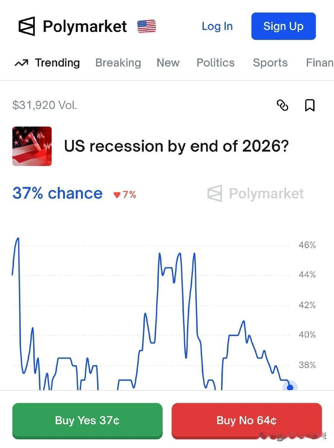 根据Polymarket的实时数据,美国2026年陷入衰退的可能性为37%。