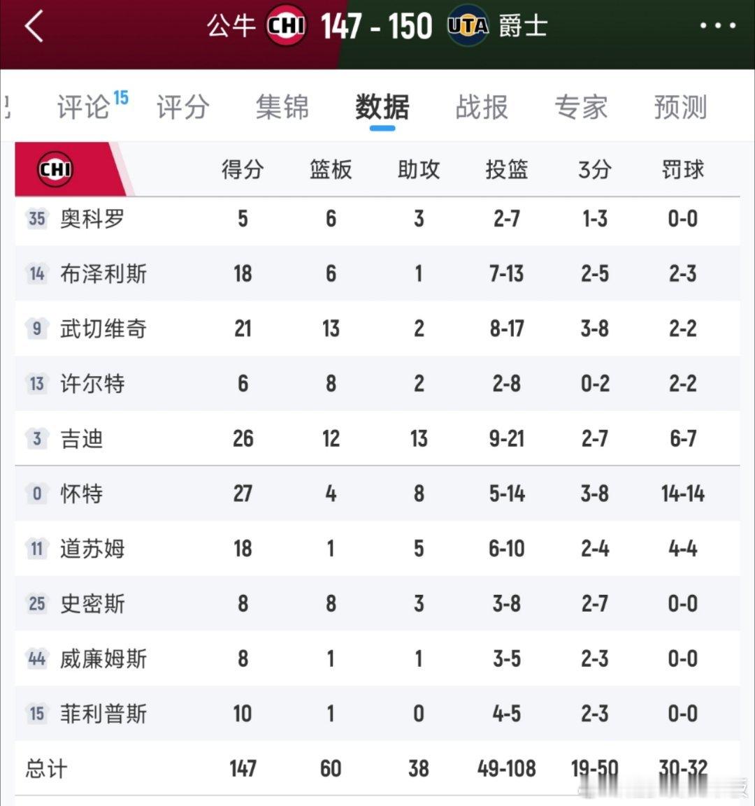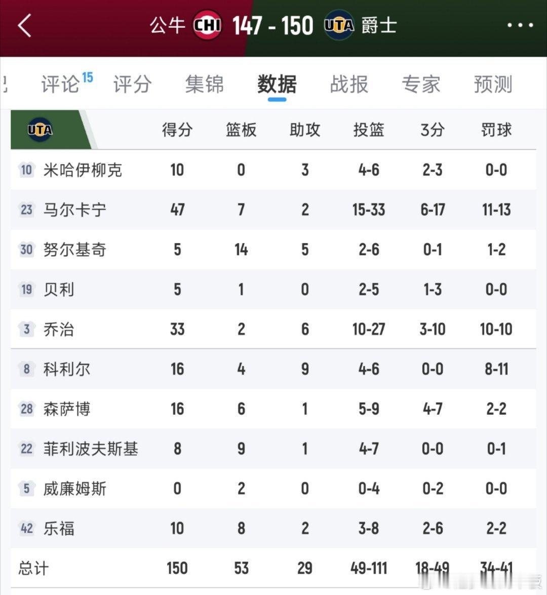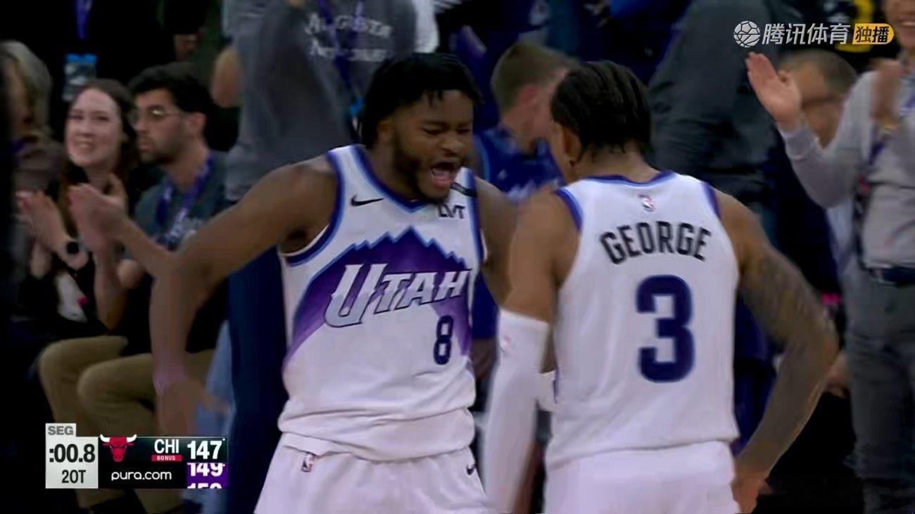基扬特-乔治三分准绝杀!爵士主场双加时150-147战胜公牛,后天将对阵湖人马尔卡宁爆砍47分,基扬特-乔治34分;公牛遭遇5连败,吉迪26分12板13助,科比-怀特25分,武切维奇21分13板绝平不中