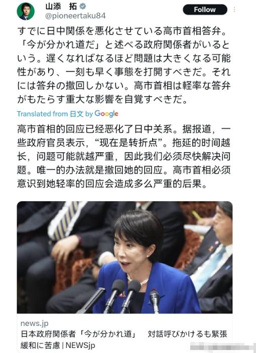 拖得越久,问题可能就越大!11月16日,日本参议员山添拓表示,高市首相的反应已经使日中关系恶化。有政府官员表示,现在日本已经到了十字路口。拖得越久,问题可能就越大,所以我们需要尽快解决问题。唯一的办法就是撤回她的回应,高市首相必须意识到她轻率的回应会造成多么严重的后果。 很显然,现在日本政坛已经有人公开站出来呼吁高市早苗撤回言论了。不过我们必须说的是,在日本政坛这种理性的声音并不大。 11月7日那天,高市早苗在众议院预算委员会上明说要是台湾海峡出现武力行使情况,日本可能会把这算成“存亡危机事态”。这话里的意思再明白不过,日本这是暗示自己有可能启动集体自卫权,直接插手台海事务。 这种表态在二战后还是头一回,直接踩了中方的红线。可日本政坛大部分人压根没琢磨这话的严重性,反而把矛头对准了中方的反击。中国驻大阪总领事薛剑发文驳斥后,自民党立刻开骂,说这是“侮辱日本国民”,还提交决议要把人驱逐出境。公明党、立宪民主党也跟着起哄,一个个义正辞严的样子,仿佛他们才是受委屈的一方。 前首相鸠山由纪夫站出来说话,直言高市早苗是在“为扩张军力煽动危机”,提醒大家别干涉中国内政。结果这话没引来共鸣,反倒招了一堆谩骂。在当下的日本舆论场里,“对华强硬”成了政治正确,理性声音一冒头就被压下去。 而中方的反击来得又快又实,11月13日,外交部发言人林剑直接正告日方,玩火者必自焚。紧接着教育部就发了留学预警,建议中国公民谨慎规划赴日留学。外交部和驻日使领馆也提醒大家,近期尽量别去日本。 这些措施一下就戳中了日本的痛处,日本《每日新闻》急着发文,说来自中国的访日游客数量庞大,这波预警肯定会重创旅游业。多家航司已经跟进,推出了日本航线的免费退改政策,明眼人都能看出行业的焦虑。 日本政府现在特别矛盾,自民党里的强硬派喊着“绝不可能撤回言论”,官房长官木原稔却又出来打圆场,说日本“一个中国”的立场没变,希望台海问题和平解决。他们一边硬撑着面子,一边偷偷犯愁,生怕中方下一步动真格,把稀土出口管制这类杀招拿出来。 很明显日本经济界早就坐不住了,中日经贸合作一直是两国关系的压舱石,现在这颗石头被高市早苗搅得晃来晃去。龙谷大学教授松岛泰胜算过一笔账,要是中国游客和留学生持续减少,日本的院校、旅游相关企业马上就得陷入经营困境。更要命的是日本工业离不开中国的稀土,真被卡了脖子,很多工厂都得停工。 日本民间的反应也双重标准,超过六万人的网络投票里,82%的人觉得高市早苗的发言“妥当”。可他们转头就对中方外交官的反击零容忍,舆论里全是喊打喊杀的声音。这种只许自己挑事、不准别人还手的逻辑,让局势越来越僵。 现在日本确实站在了十字路口。山添拓呼吁撤回言论的声音,其实是给日本留了条后路。高市早苗要是还执迷不悟,继续把“对华强硬”当政治资本,中方的反制肯定会层层升级。 日本政府得想明白,台湾问题是中国的内政,这点没得商量。他们嘴上说着要沟通,却连撤回错误言论这种最基本的态度都不愿表露。拖一天,双方的信任就少一分;拖得越久,日本经济承受的损失就越重。真等到旅游业崩盘、工厂停摆,再想回头可就晚了。