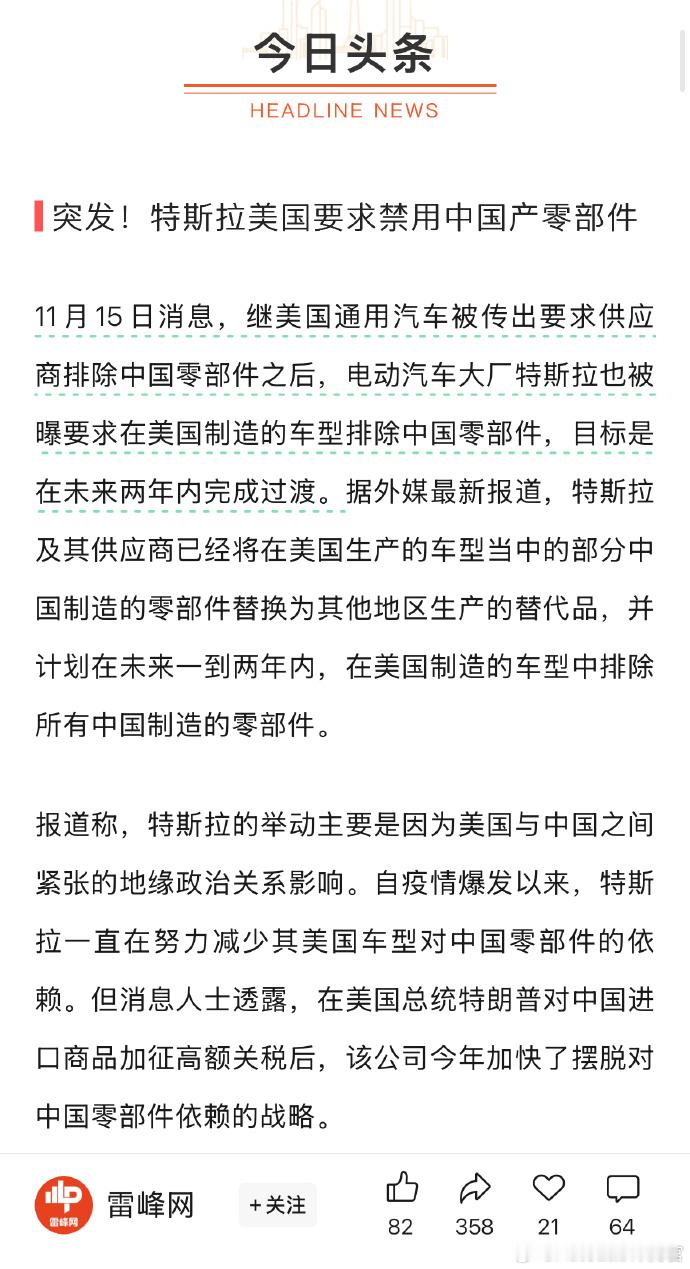 特斯拉被要求禁用中国产零部件——恭喜美国老百姓,可以买到又贵又粗糙的特斯拉了。