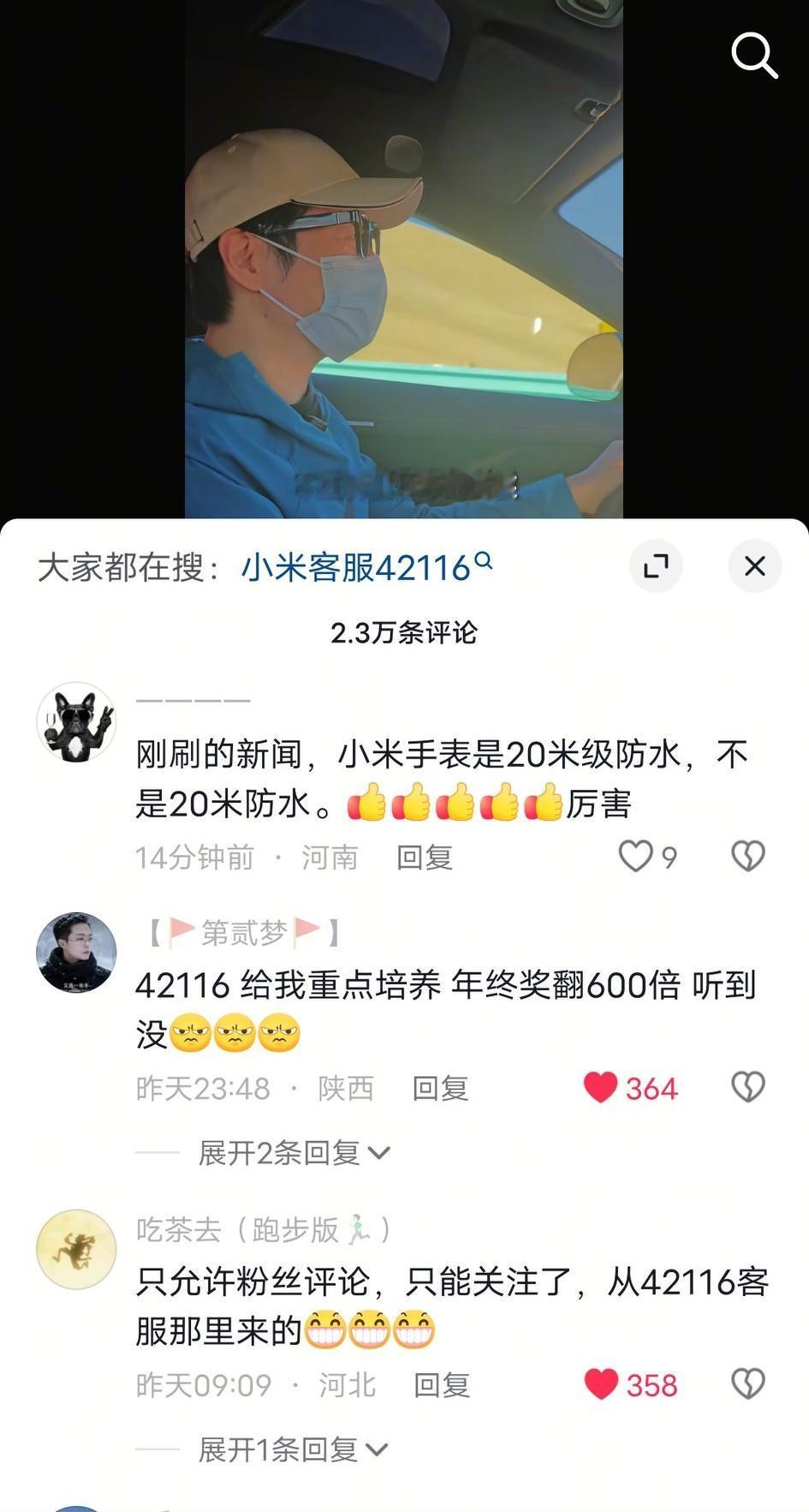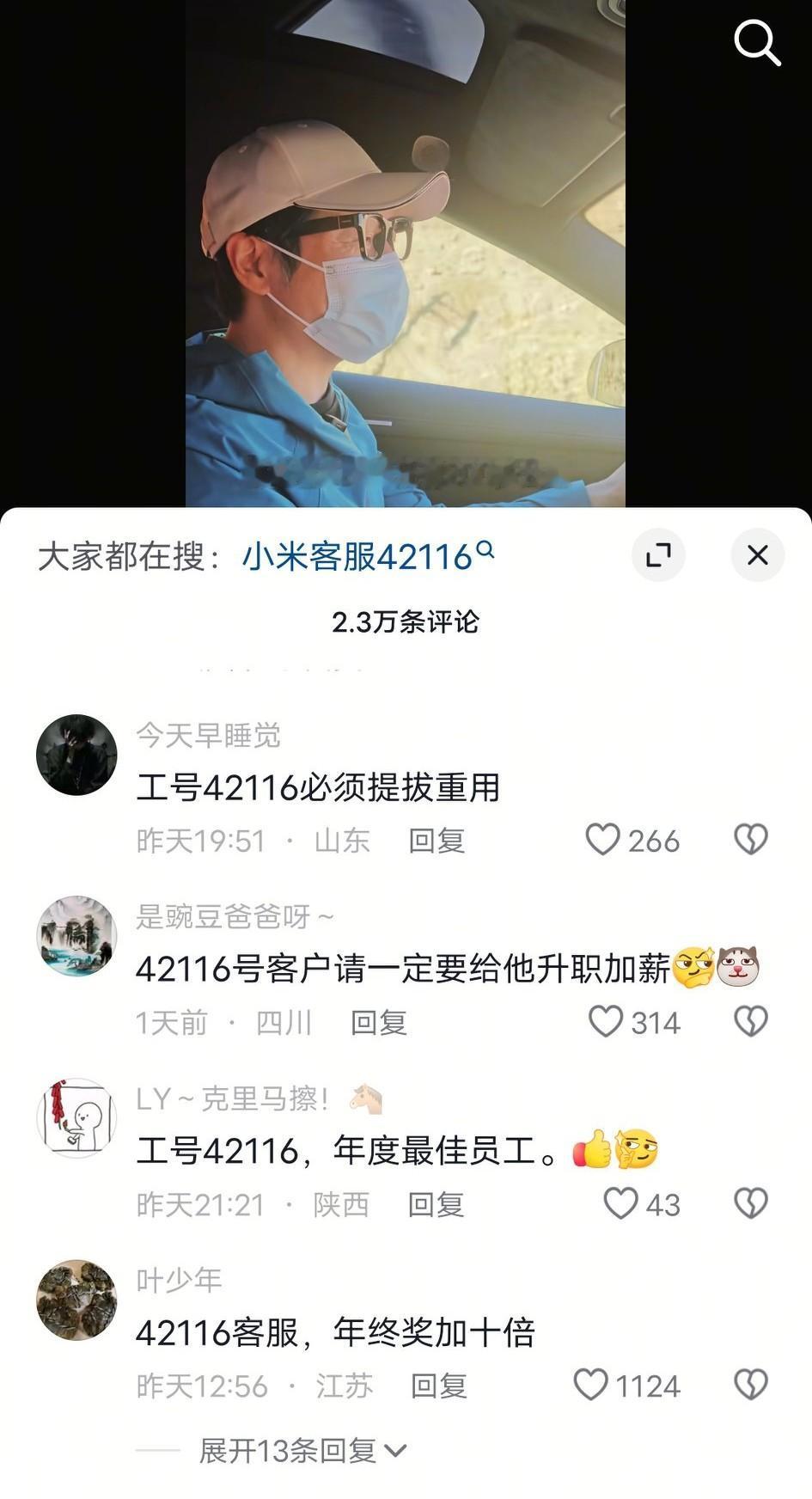 雷总11月10日在某音账号上发布了一条视频,讲的是他开小米yu7在新疆拍摄唯美照片的事情。可评论区里面怎么讲的都是“工号42116”的事情,难得几条不讲这个的,又是小米潜水手表的事情…… 这到底咋回事,雷总的评论区怎么画风突变啊? 雷总昨天就小米汽车的几个话题,连发三条博文进行了回应。里面说的清清楚楚,安全是基础和前提,在安全的前提下,尽可能把汽车的颜值和轮毂做的更好看一点,这本来没有错。有些网友可能断章取义了。而“工号42116”这个事情上,广大网友是不是也没有了解到事件的全貌啊?