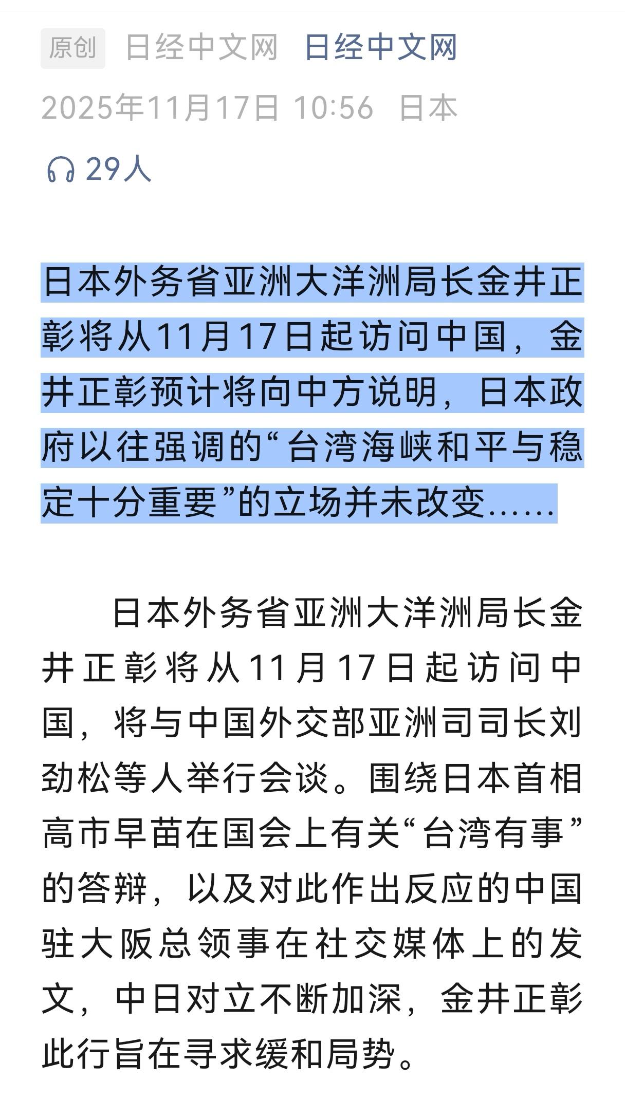 昨天我提到日本国内部分内阁成员认为,紧急派一个使团到中国访问灭火,以此换取中国方面的原谅,今天日本方面已经在这样做。据日经网报道:日本外务省亚洲大洋洲局长金井正彰将从11月17日起访问中国,金井正彰预计将向中方说明,日本政府以往强调的“台湾海峡和平与稳定十分重要”的立场并未改变。这次性质这么恶劣,日本派这么低级别一个访问团,恐怕过不了关。