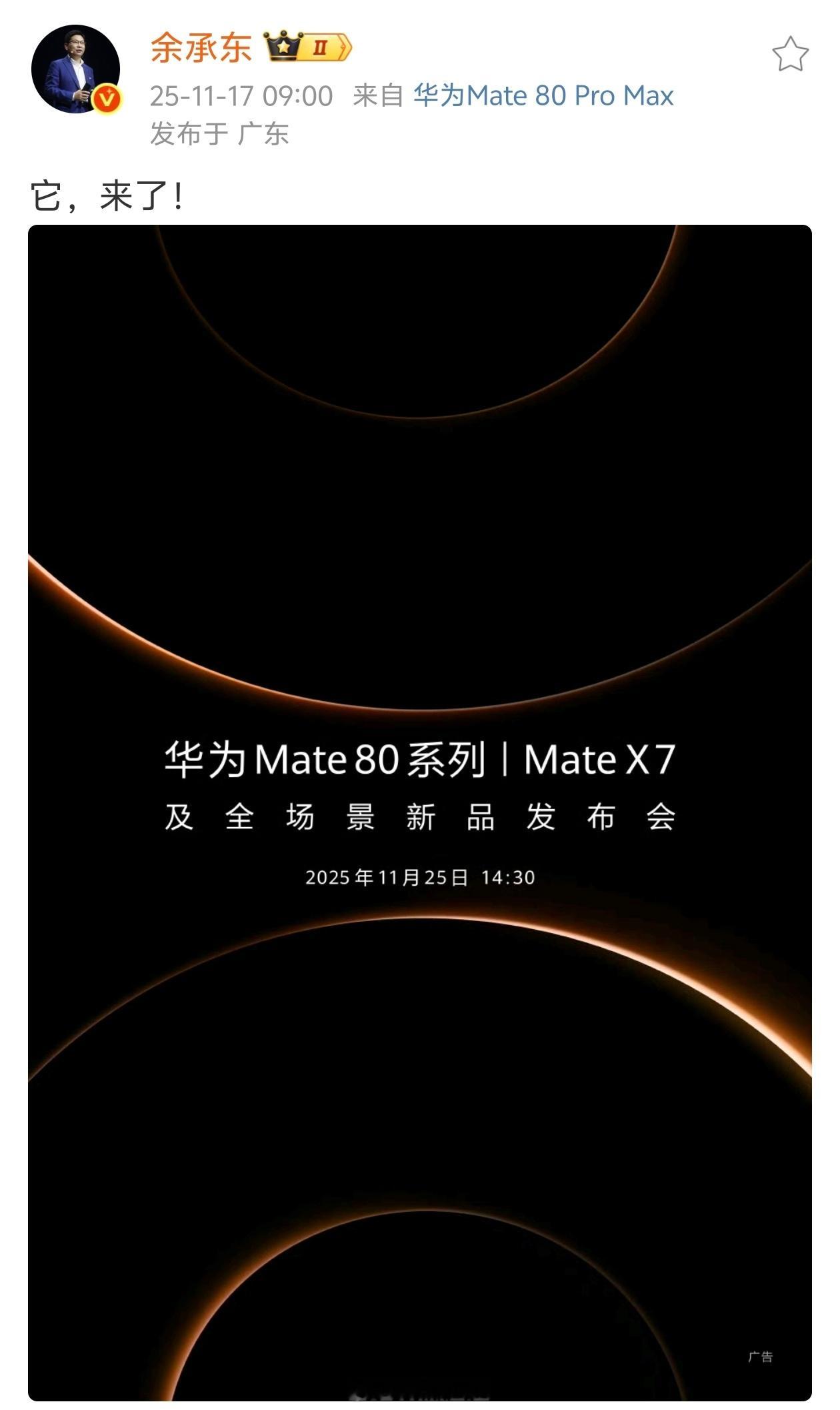 终于来了,华为 Mate 80 系列、Mate X7 发布会定档,11 月 25 日举行,余总的微博小尾巴已经换上 Pro Max 了。