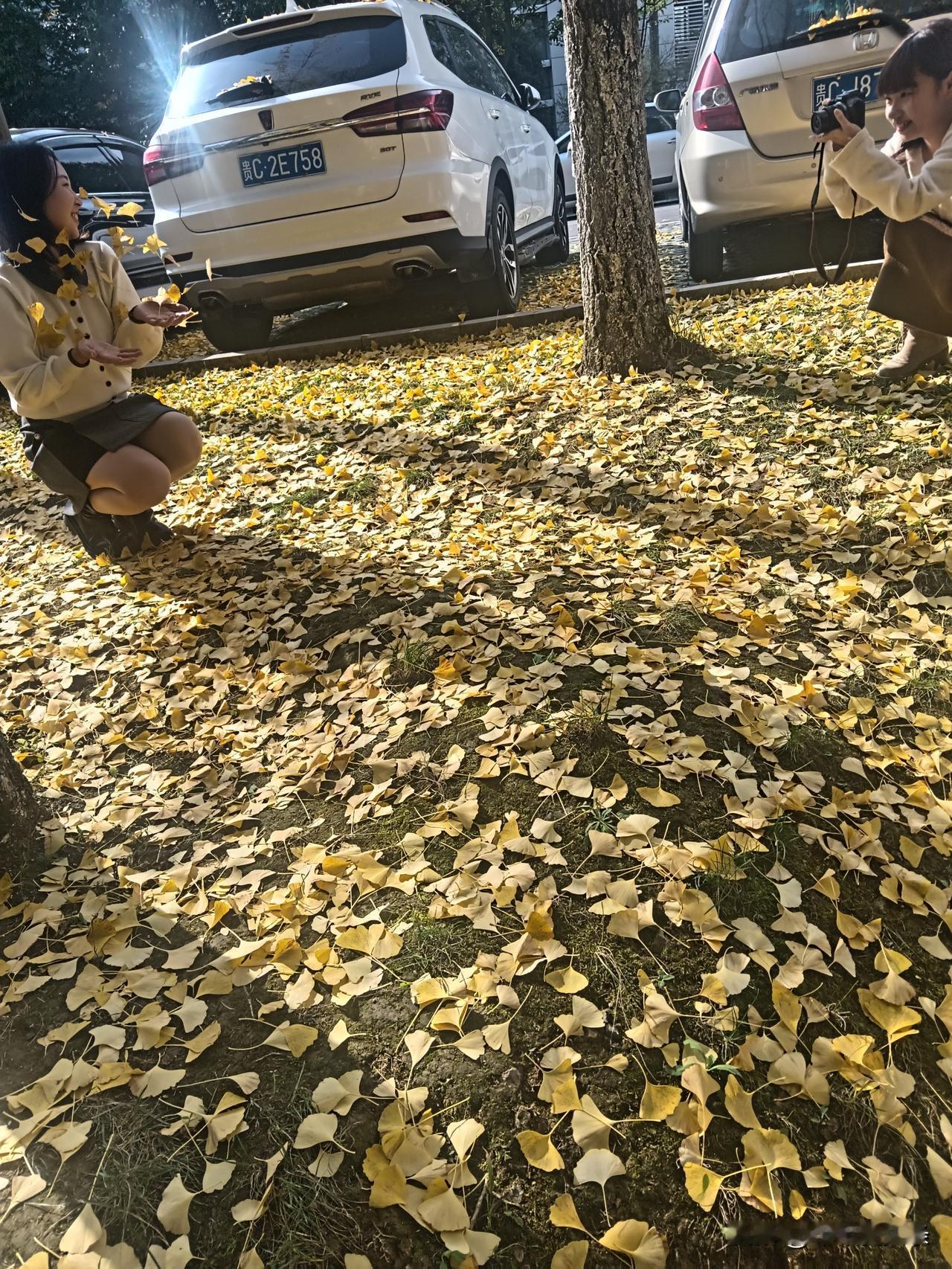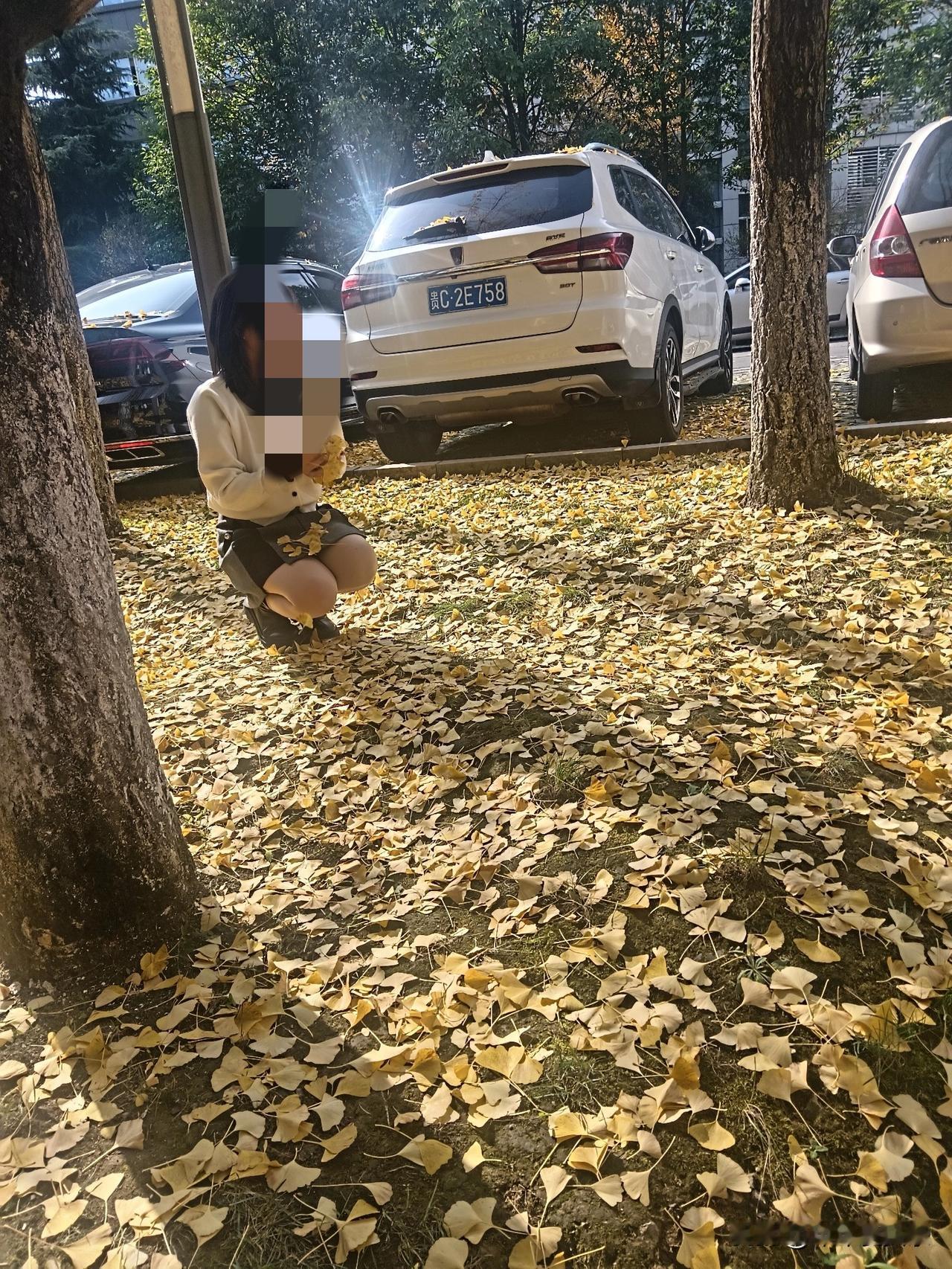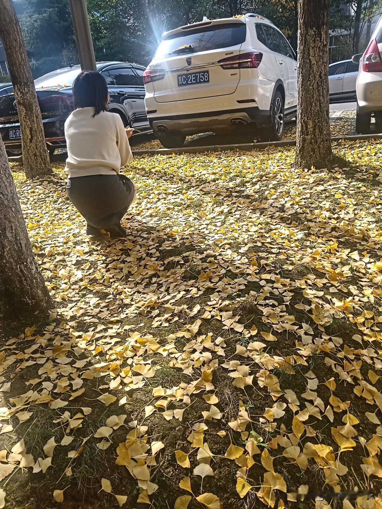 路过这美景,就把这小妹偷拍了,不过经过她允许的,这片美景,只要路过的都会停留片刻,这小妹就是有人在专门给她各种拍。 还有几位大妈正好在这里拍抖音,因我要赶车,也没时间拍她们了,只好急怱怱的赶车上班。 看着这满地金黄的银杏叶,就像时光给我们洒下的碎金,蹲在树下的人小妹景象,仿佛就像握住了了已去的秋天。阳光穿过枝叶,在地上织就一幅流动的画,连空气都染上了这金黄味的色彩呢。- 原来景色最打动我们的,不是轰轰烈烈的告白,而就是这样安静的瞬间,风把故事说给叶子听,叶子把心事铺成地毯,而我们刚好路过,成了画里的人。