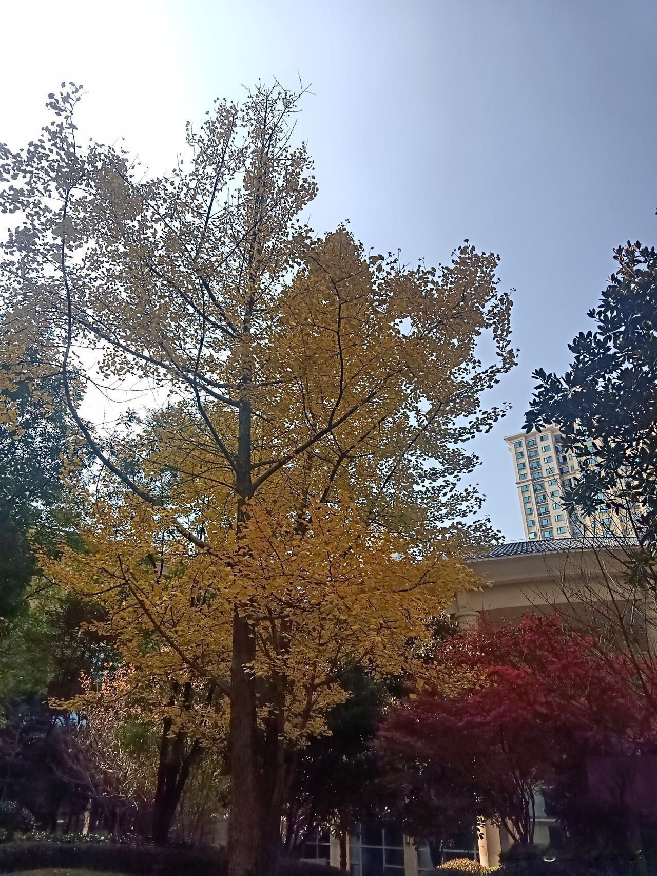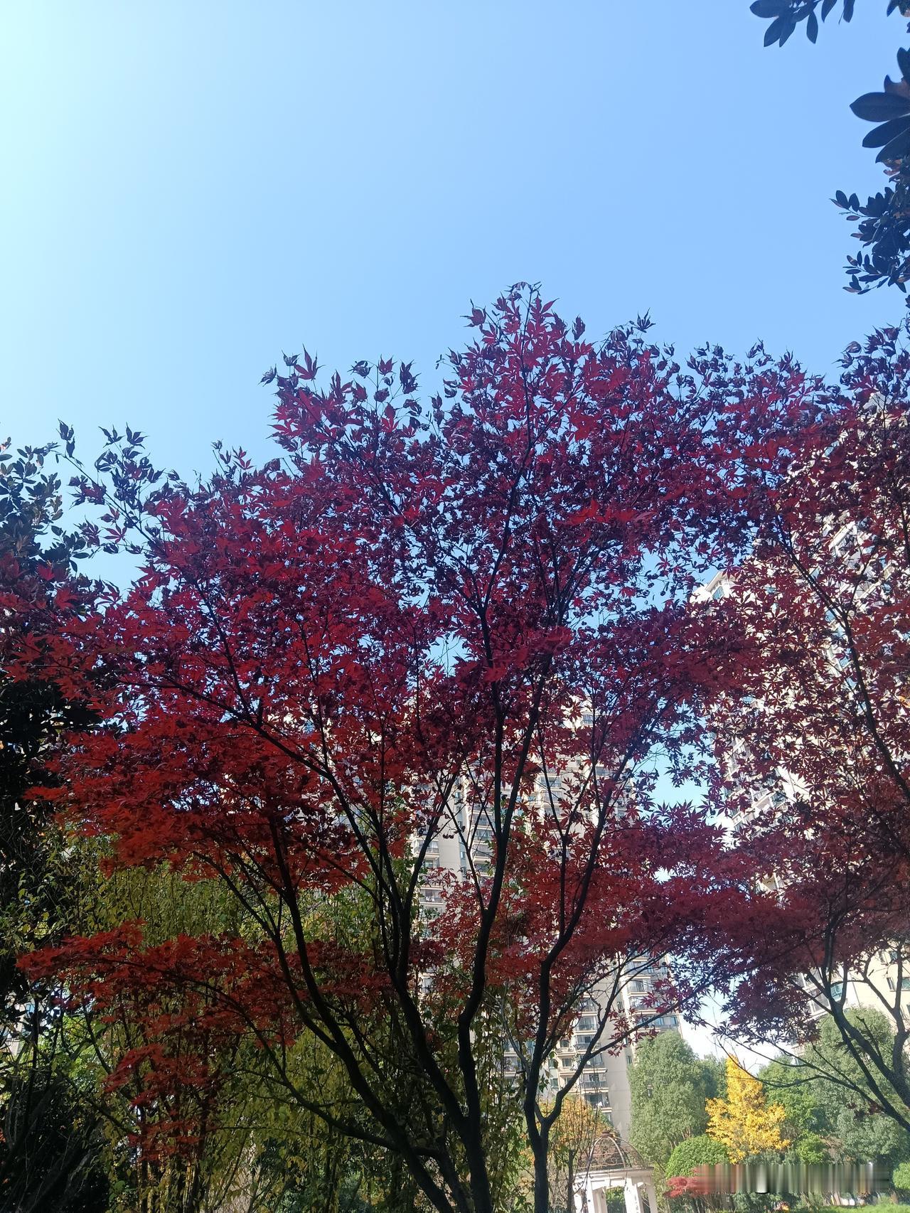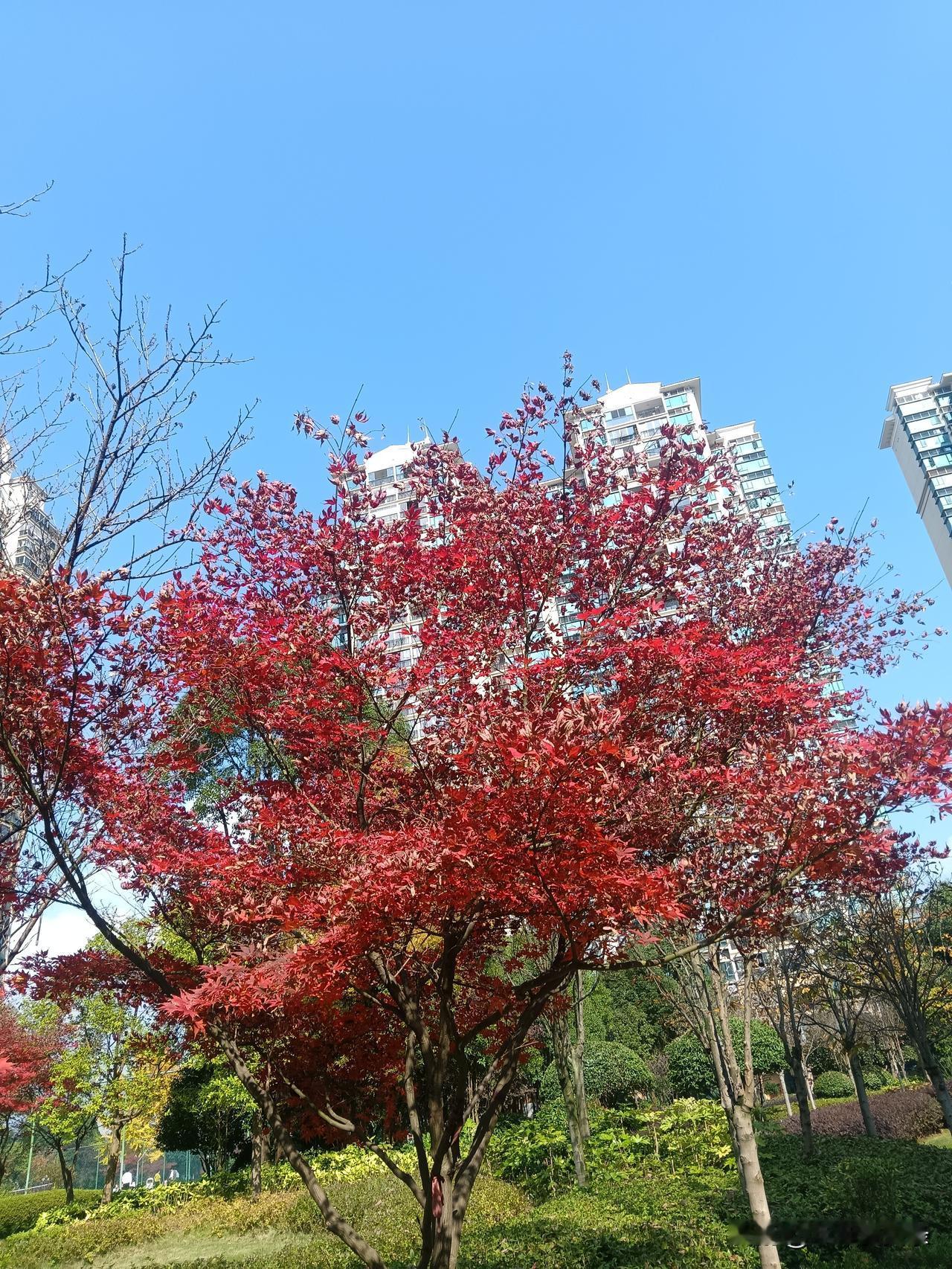 初冬的阳光穿过层叠的红枫,将叶片染成透亮的胭脂色。虬曲的枝干向上伸展,托起满树火焰般的红叶,与澄澈的蓝天相映成趣。叶片在风中轻颤,光影斑驳间,仿佛能听见秋的私语。 小区的高楼与近处的绿植构成背景,却丝毫抢不走这抹红的热烈——它是自然写给季节的情书,是时光沉淀后的绚烂绽放。不必追寻远方的诗意,眼前这一树红枫,便藏着深秋最动人的答案。 在苗族文化里,红枫可是有着特殊意义的。传说中,苗族始祖蚩尤在战斗中牺牲后,他的鲜血染红了枫叶,从此枫叶便成了红色。所以苗族人对枫树特别崇敬,甚至盖房子立中柱都必须用枫木,认为这样能得到始祖的庇佑呢