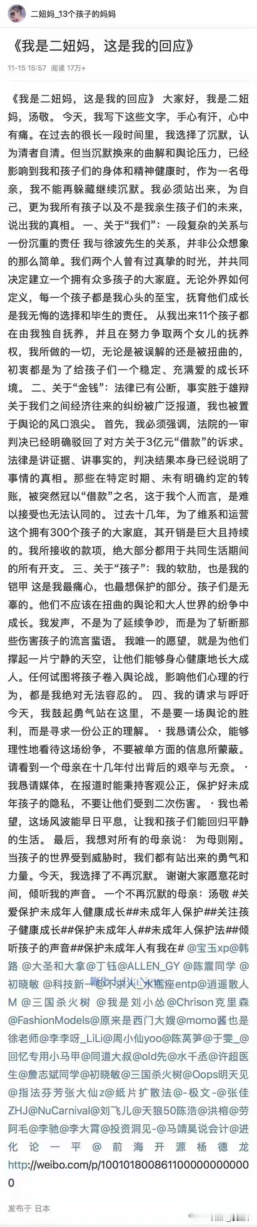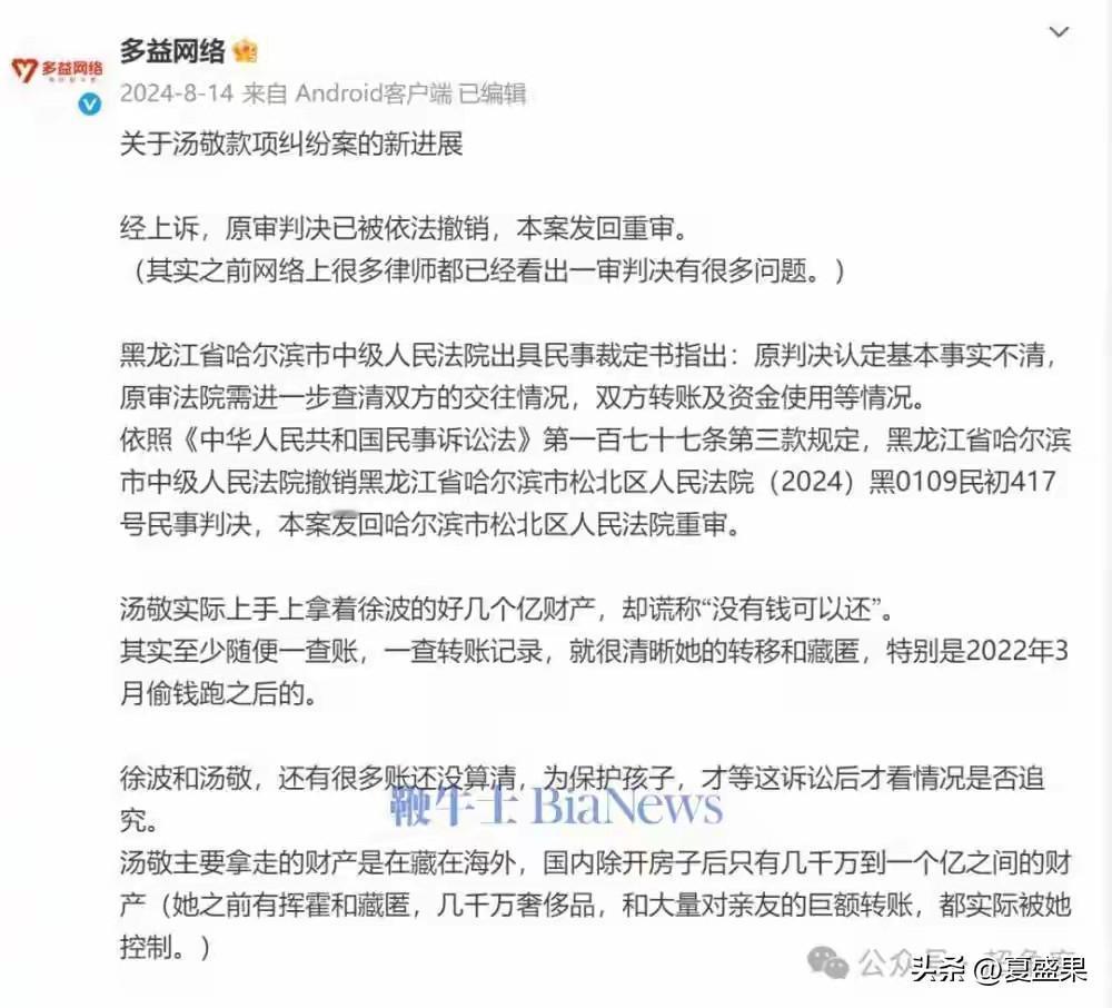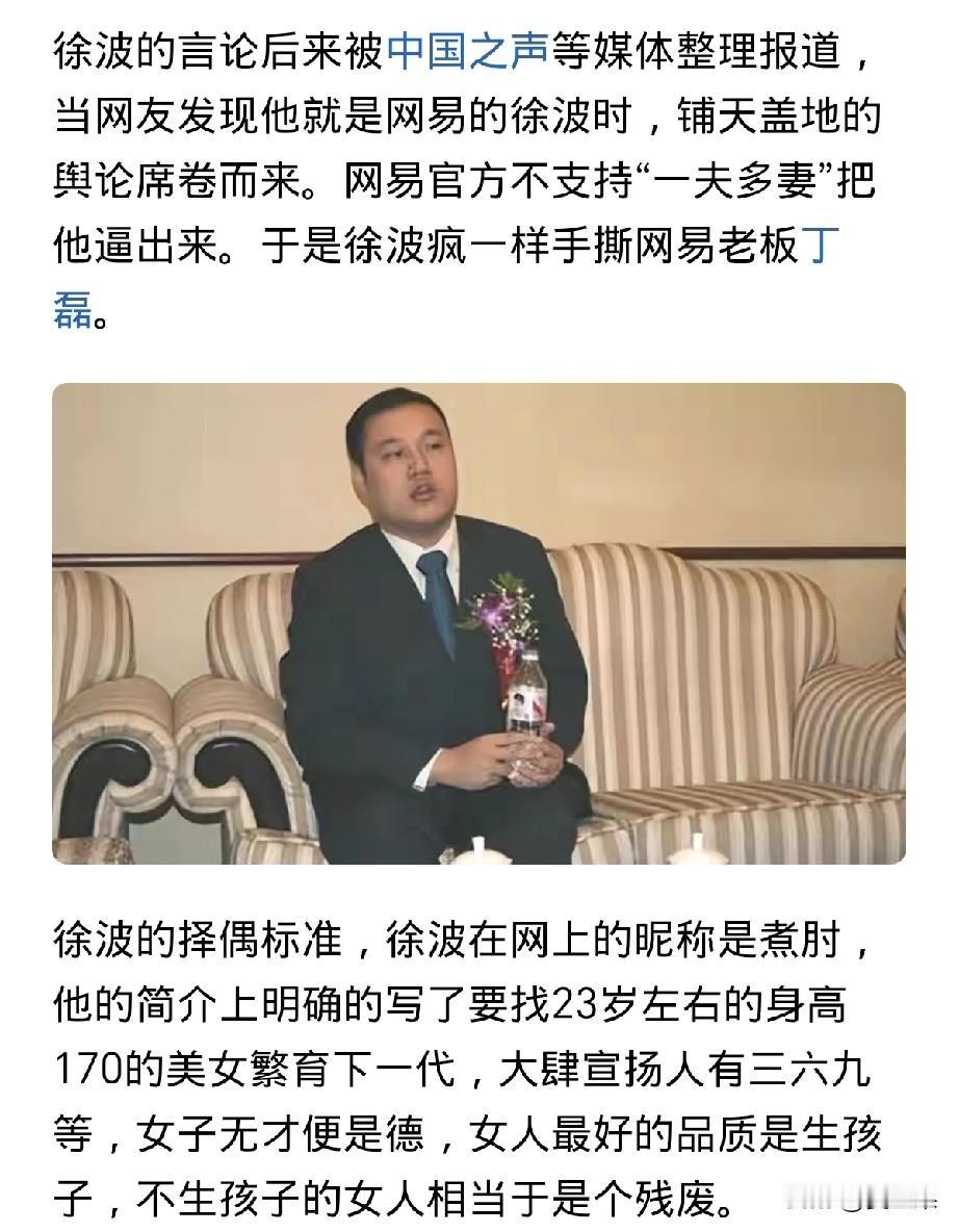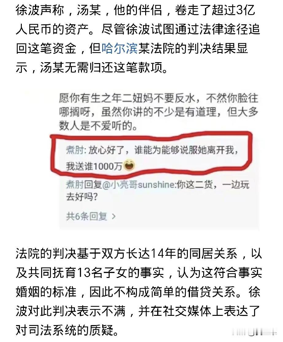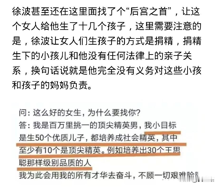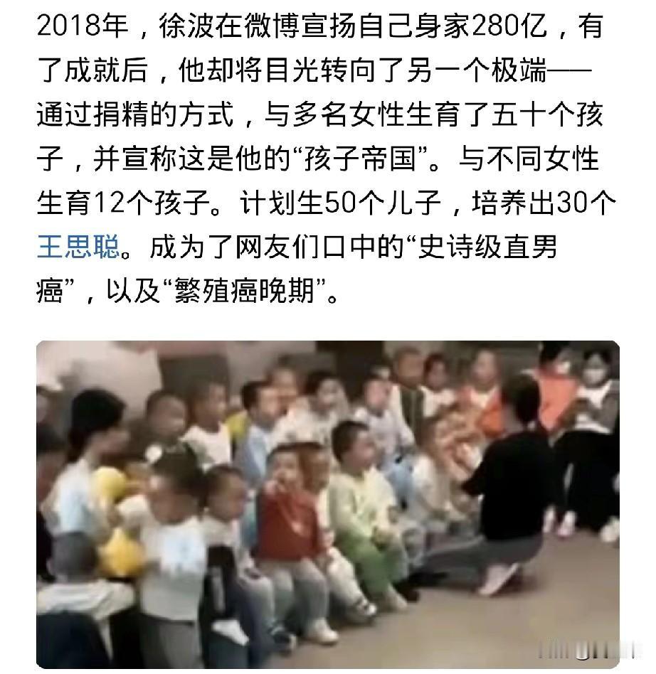 到处流传徐波和他300个孩子的故事, 不是编的故事,是真人真事。 徐波是谁? 一家有名的网络游戏公司的掌门人,屡次上胡润财富排行榜。 这个人能力不小,品质确实不高。 他说: 女子无才便是德, 女人活在这个世上最好的品质是生孩子, 女人不生孩子就是残废。 他把女人当成了生殖工具。 一方面,他极其贬低女性, 一方面,他极其高看自己,相当自恋。 从2018年起,他决定用自己的好基因培养出五十个像他这种精英。 于是,他疯狂捐精,就像一头纯粹留种的种马一样,只管播种。 现在,他起诉他的女友,汤敬,跟他共同居住了14年,共同抚养了13个子女的女人。 他说汤敬,卷走了他三亿人民币。 可是最近法院判决,汤敬无需归还。 可是这个徐波跟他的公司还是不依不饶。 结果,被汤敬在网上爆料。 根据汤敬说的, 近年来,这个徐波致使多人怀孕至少诞生出300个孩子,这300个孩子他也不管不问。 天呐! 这个人还真把动物的一面展露得淋漓尽致。 汤敬说, 她要讨要跟他共同生的孩子的抚养权,可是现在自己被追杀到日本。 看ip地址就是在日本。 有人让她归还那三亿不就行了,免得受到生命威胁, 可是她说,她根本就没拿。 可是徐波公司还发微博要上诉,重审,必须把钱追回来。 三亿,凭你上了胡润财富排行榜的人, 还不是毛毛雨啦? 凭她给你生了孩子,抚养13个孩子的份上,给她又能怎样? 难道说,还有更不为人认知的内情? 总之,这徐波真不怎么样。