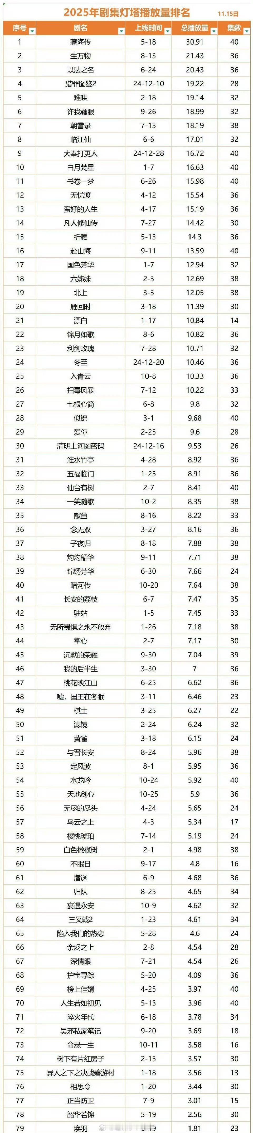 2025年剧集灯塔播放量排名统计: 藏海传 生万物 以法之名 这三部真的实至名归