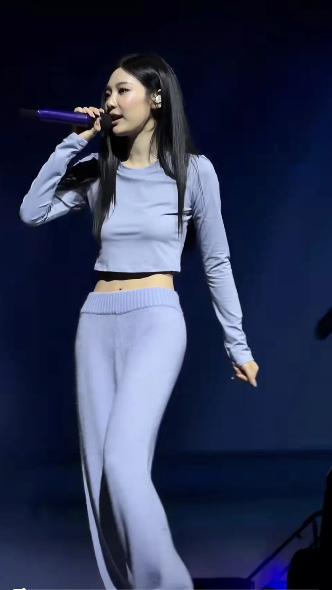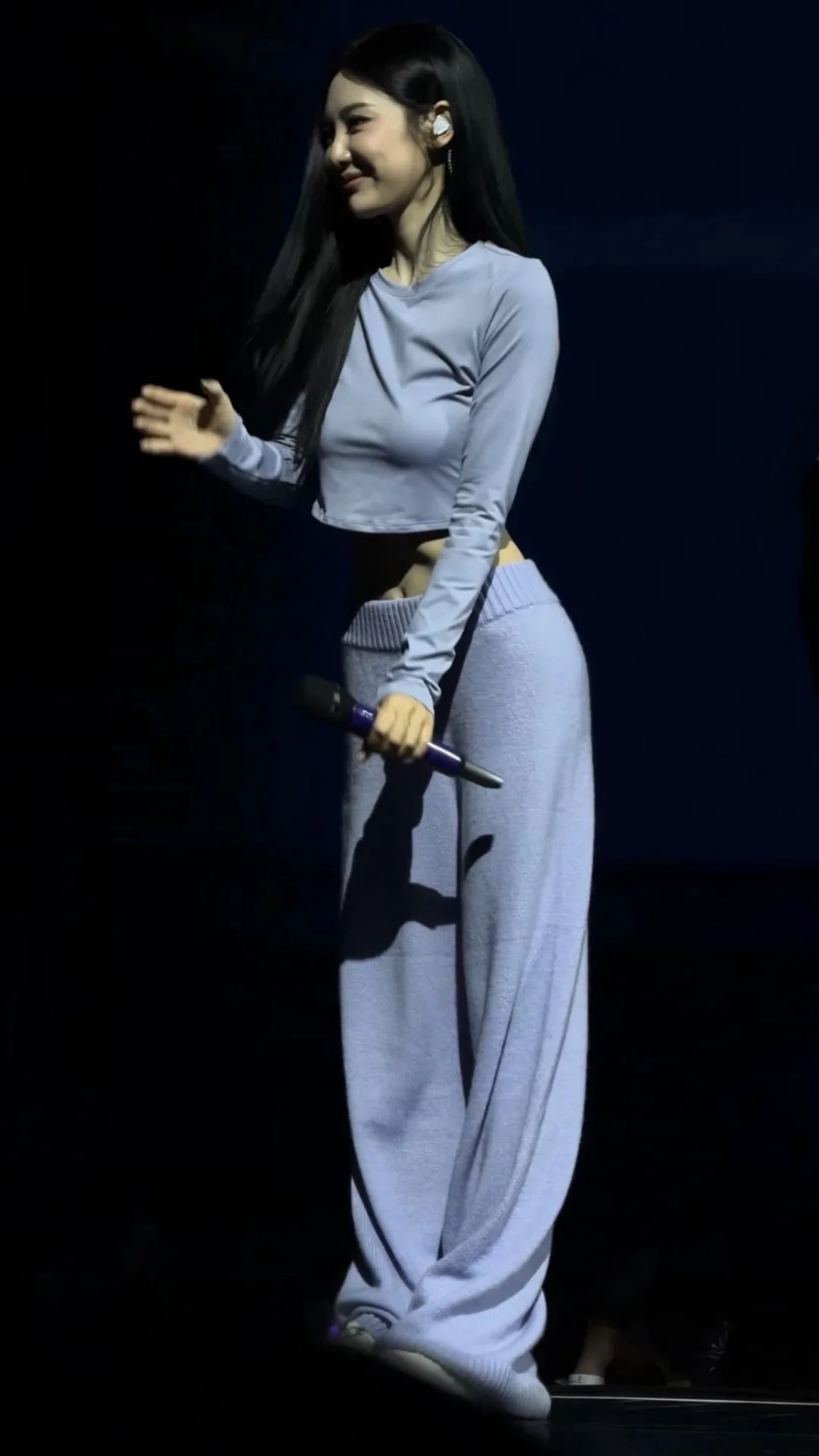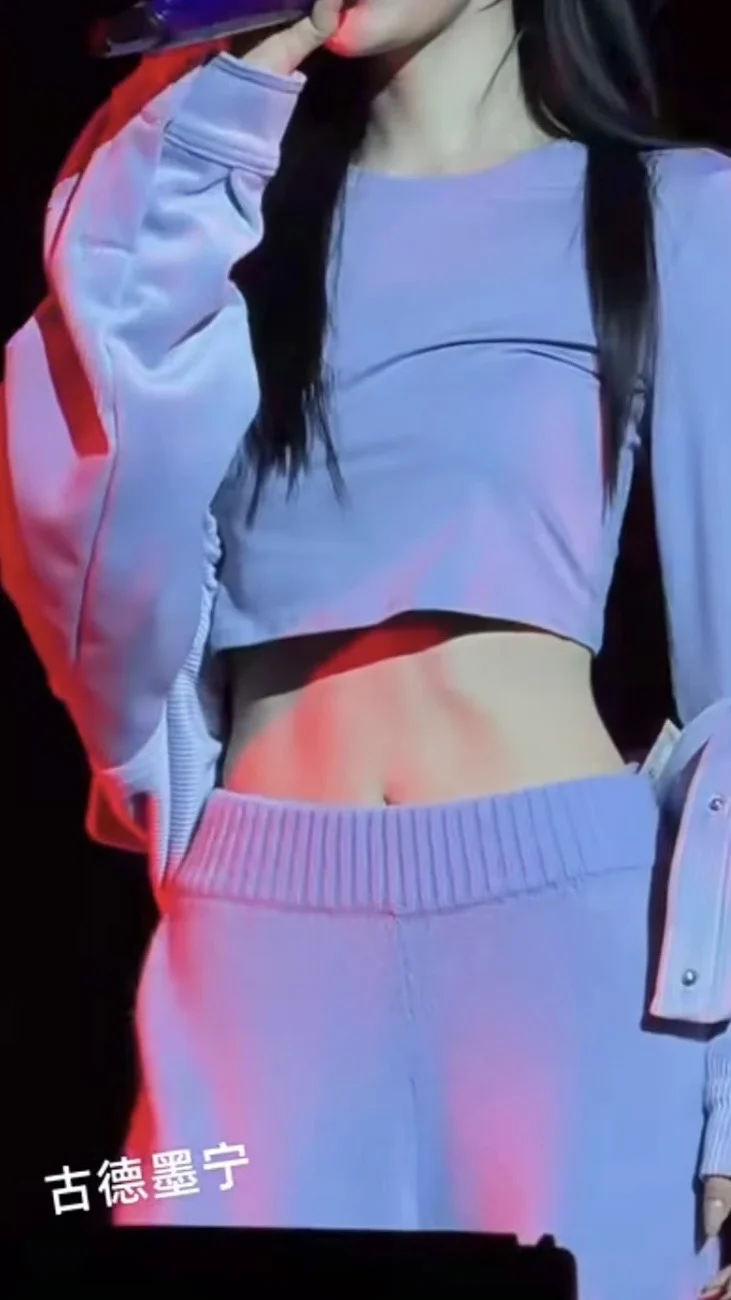 救命这生图我直接美到失语!浅蓝露腰套装衬得宁宁纤薄又舒展,弯腰托腮,软乎乎的,舞台状态能循环亿遍🥹