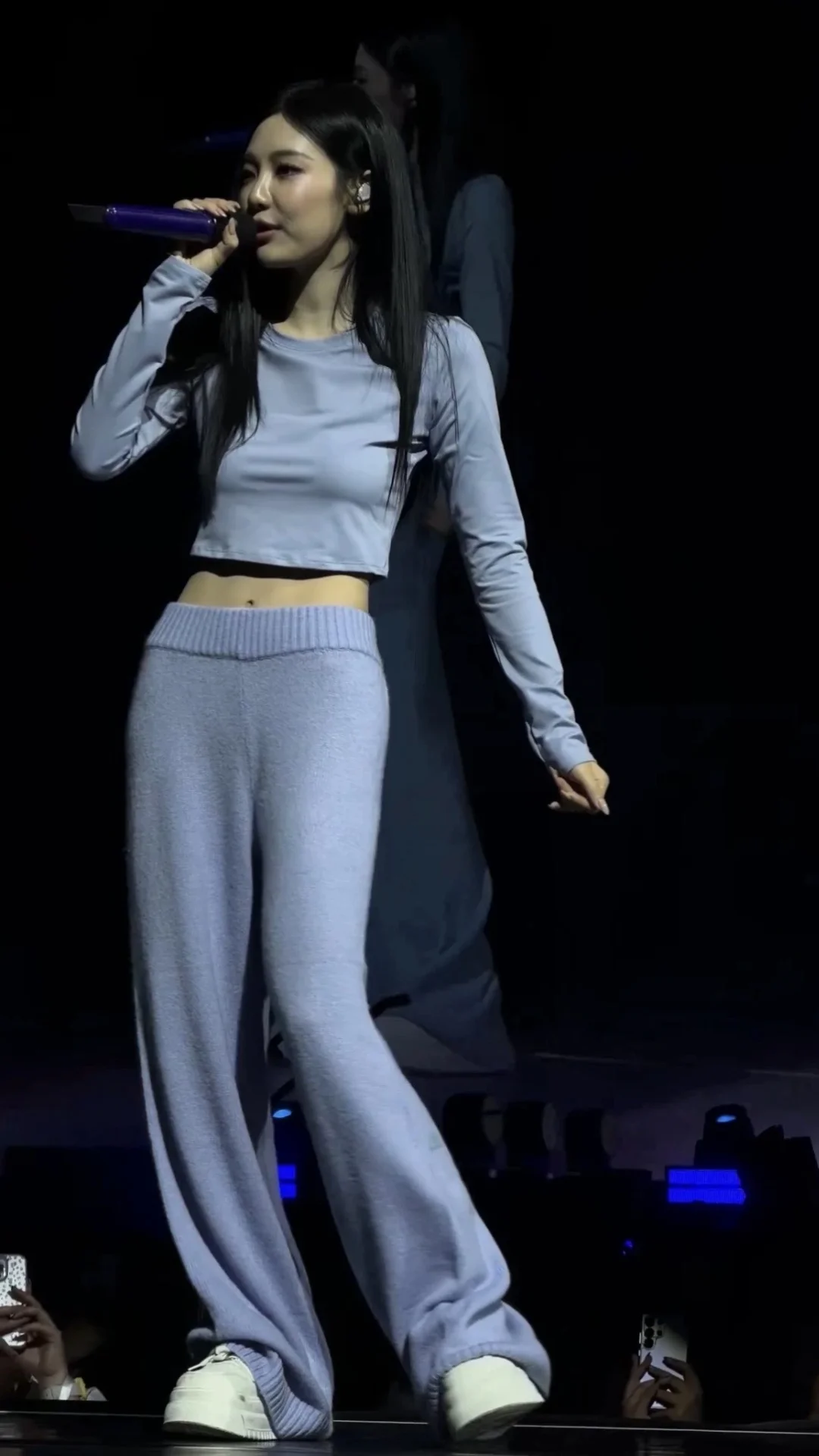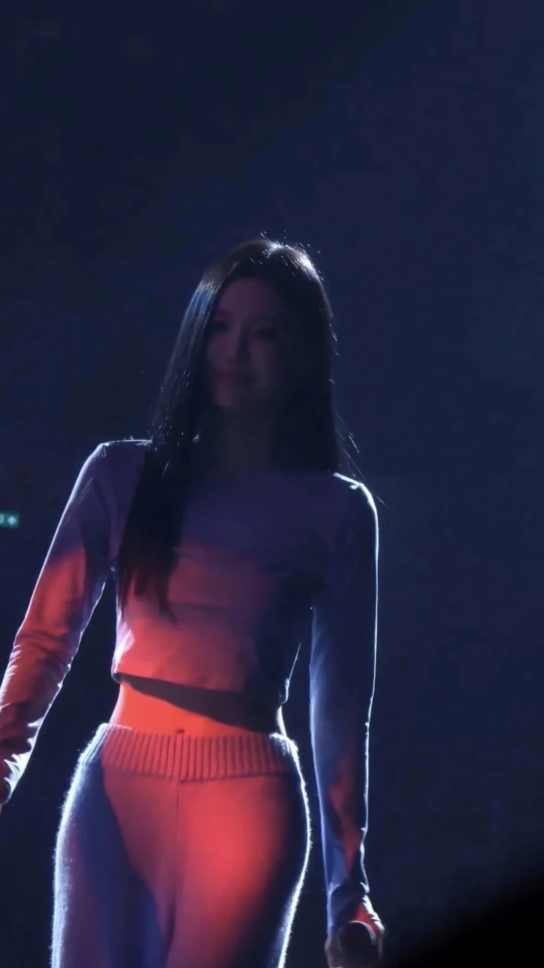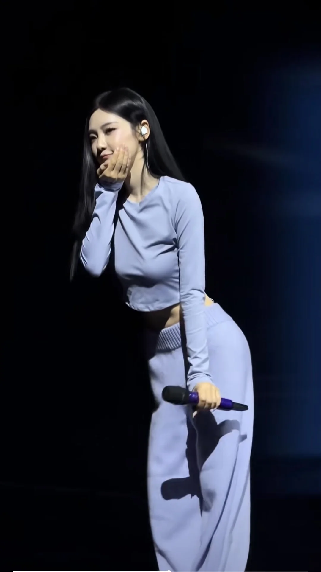 救命这生图我直接美到失语!浅蓝露腰套装衬得宁宁纤薄又舒展,弯腰托腮,软乎乎的,舞台状态能循环亿遍🥹
