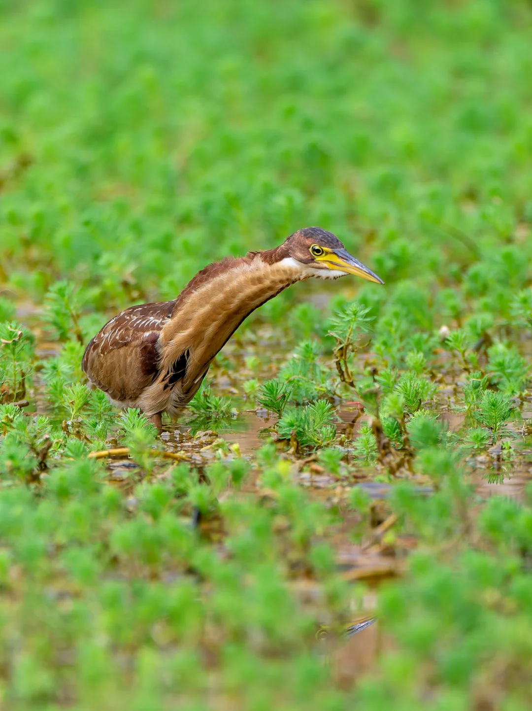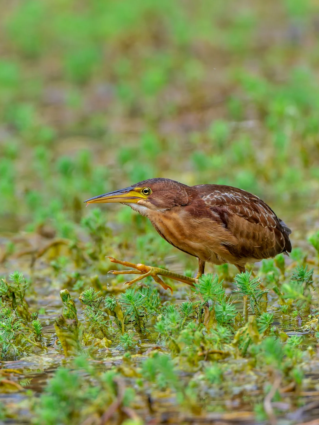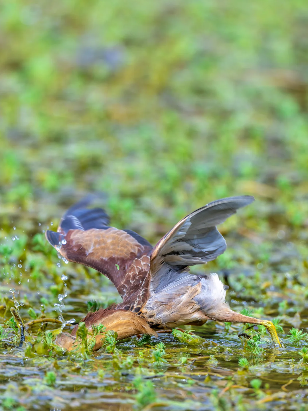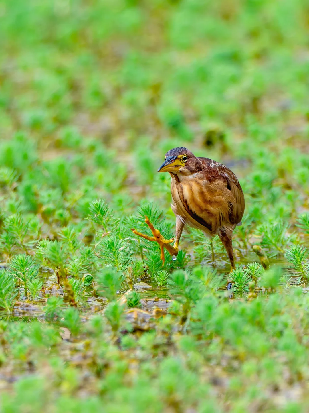 原创拍摄于2025.11 紫背苇鳽,Von Schrenck's Bittern,鹈形目鹭科苇鳽属。这种漂亮小巧可爱的涩禽,是在西伯利亚和我国东北繁殖,冬天会迁徙到东南亚。 紫背苇鳽头顶黑褐,背是栗褐,略略显得有点紫,有中央喉线,雌鸟跟雄鸟相比更暗淡,背密布白色小点。 现在正是紫背苇鳽迁徙过境大湾区的时候,去年也是这个时候有一只到了深圳大学,但是那只翅膀受伤,不知道后来去向如何。今年在华南师大的这一只看上去非常的大方,一去就接见所有鸟友,自信觅食,不到半小时就捕获多只虾和一条大鱼,真是厉害!