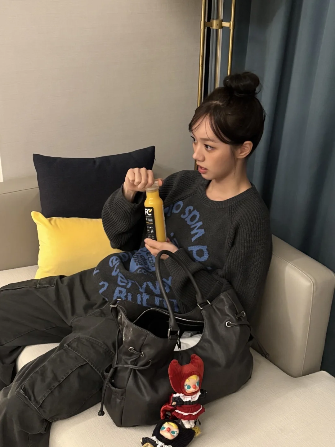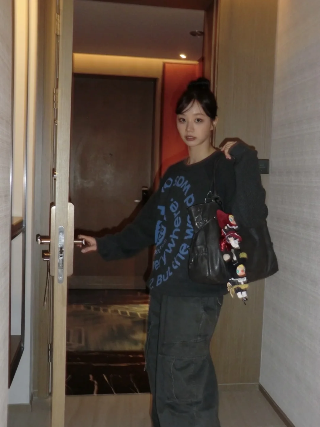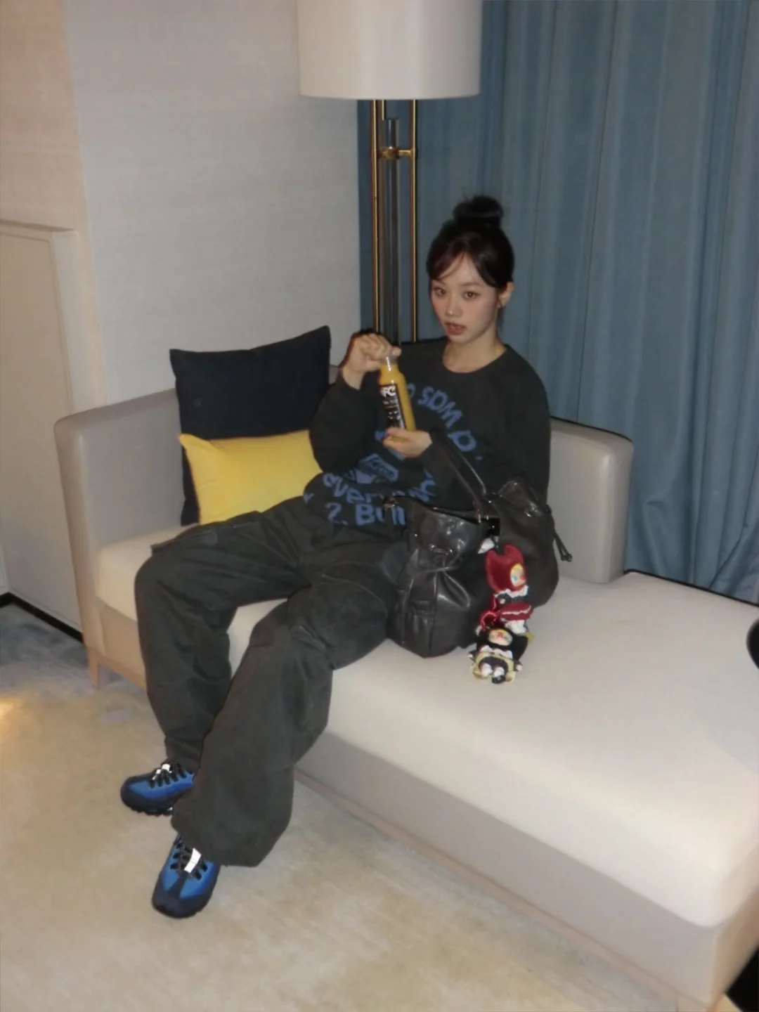 德善本人的私服也太松弛了吧!李惠利这组宅家穿着我直接抄 暗色系穿搭低调不张扬,但卫衣字母、鞋子撞色这些小细节又很有质感,工装裤的垂感直接把腿型衬得很顺