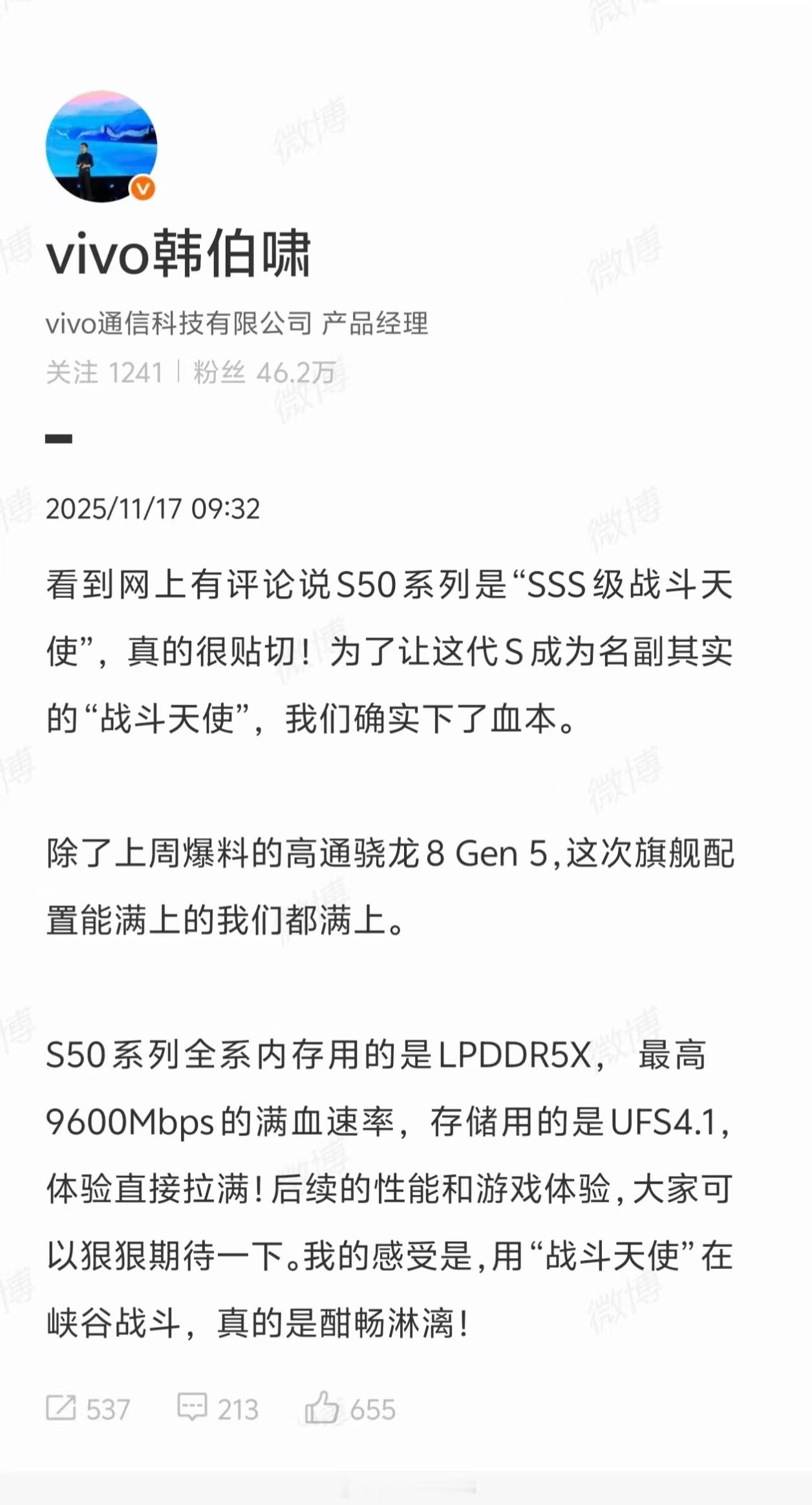 vivo S50 系列定档 12 月发布,全系 LPDDR5X 内存 + UFS4.1 存储组合,S 系列也是好起来了。