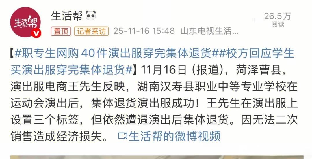 湖南常德某学校学生网购40件演出服,用完7天后集体退货,商家收到布满污渍、明显穿